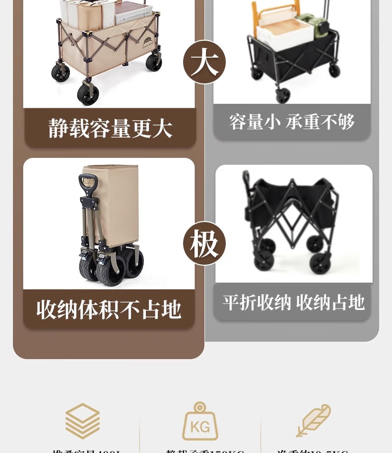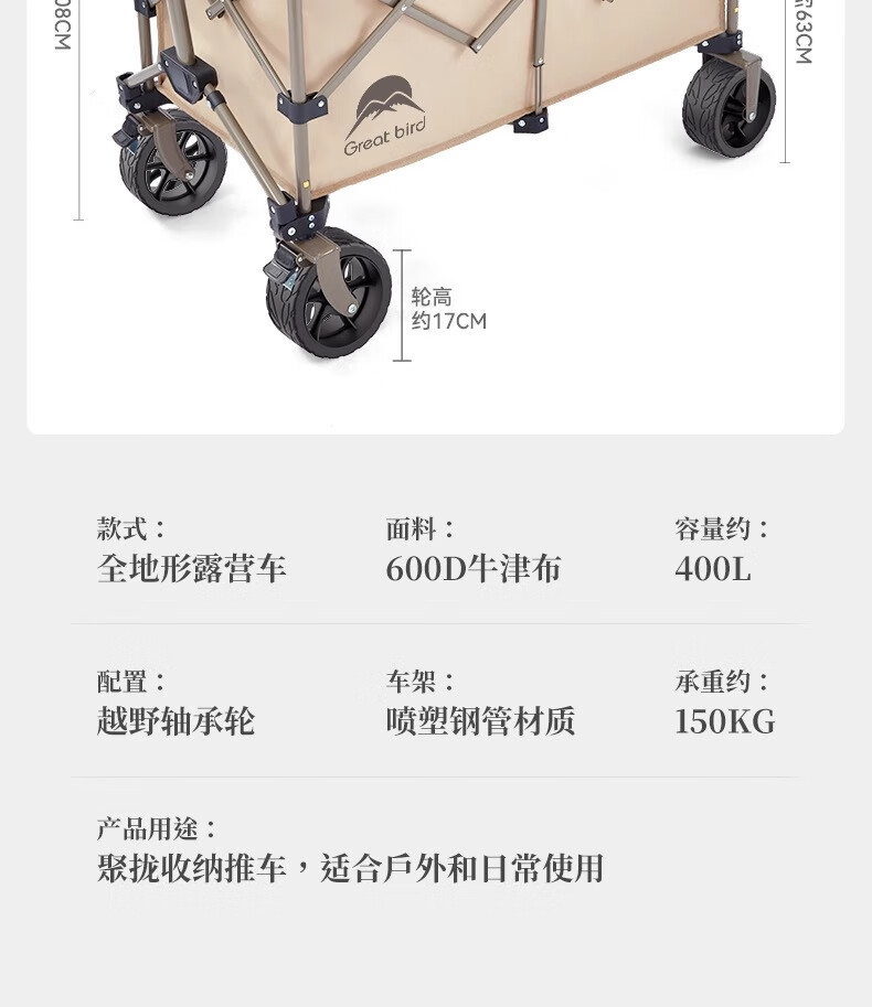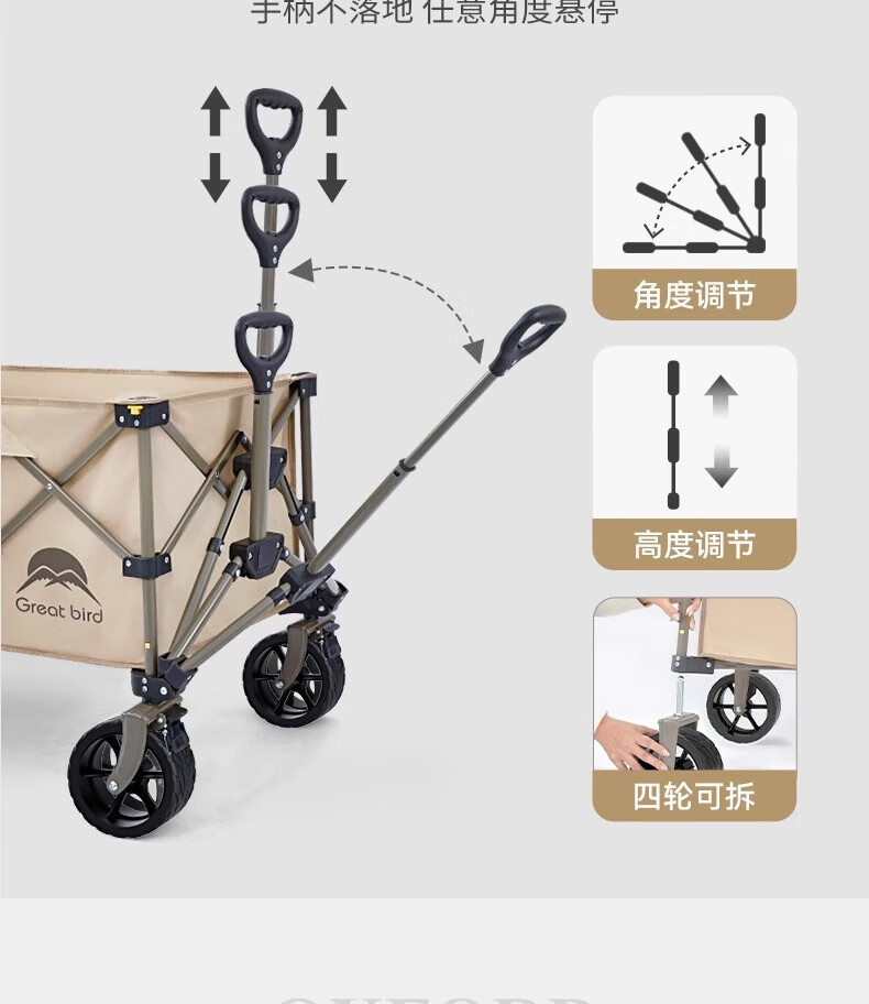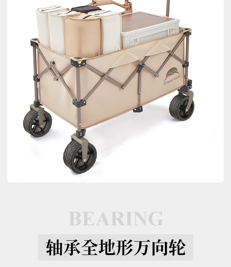 出色鸟Greatbird聚拢款露营推车儿童可躺户外折叠野餐手推野营小拖车旅行营地拉车 150L【飞机轮+聚拢收纳】卡其色
