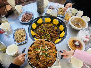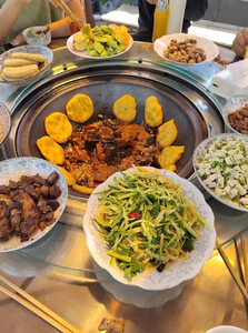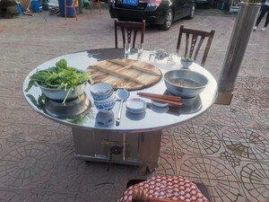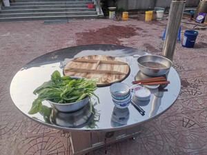 这个灶台的材质和质量真不错,桌面可以摆盘子,摆满一桌菜,土鸡搭配铁锅饼子很受大家的欢迎非常好,圆桌不吃饭时可以拆下来,使用很是方便,在家也可以做铁锅炖了,烧起来也很好一点不跑烟