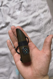 物流速度还算可以吧?刚到手的时候有些意外,比想象中的要大一些,不过也还好,挂在脖子上也可以方便随身携带,配有一片小镜子,放大镜,指南针,温度计与口哨结合为一体,方便使用