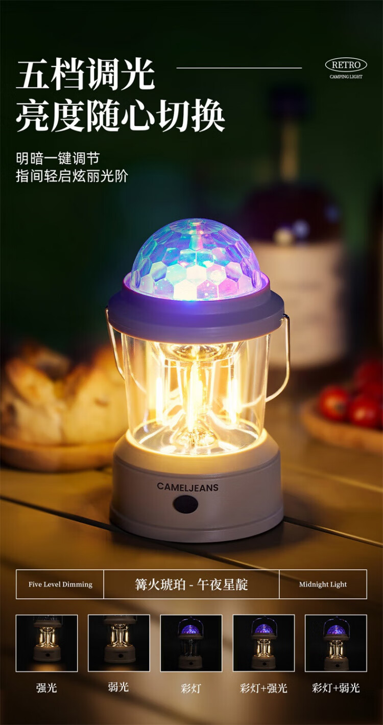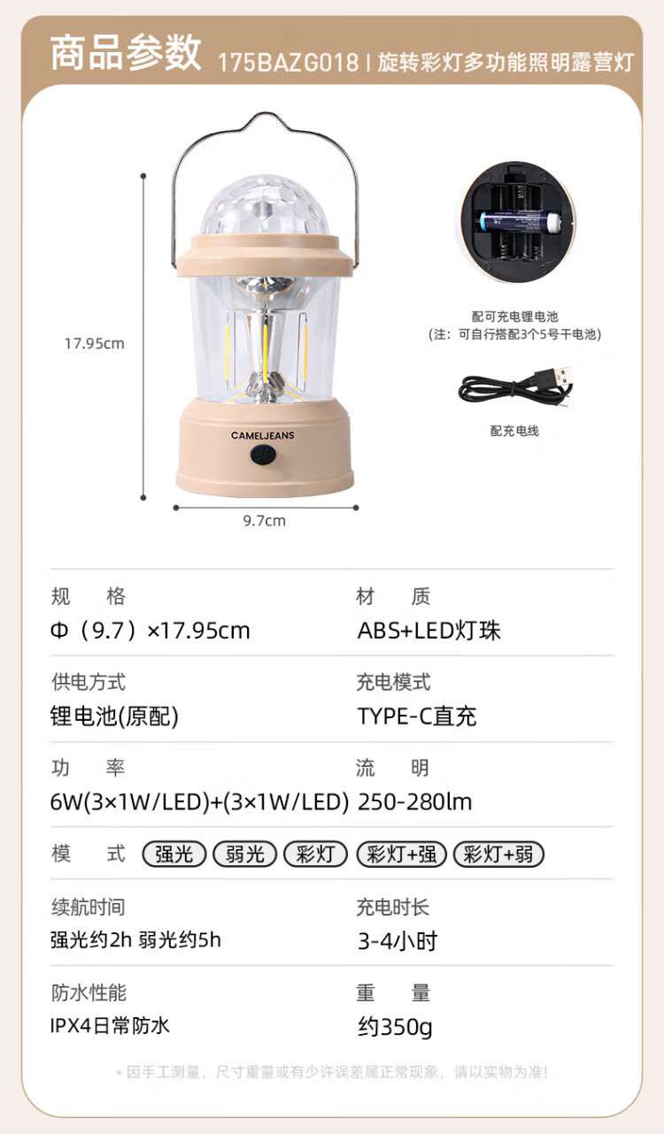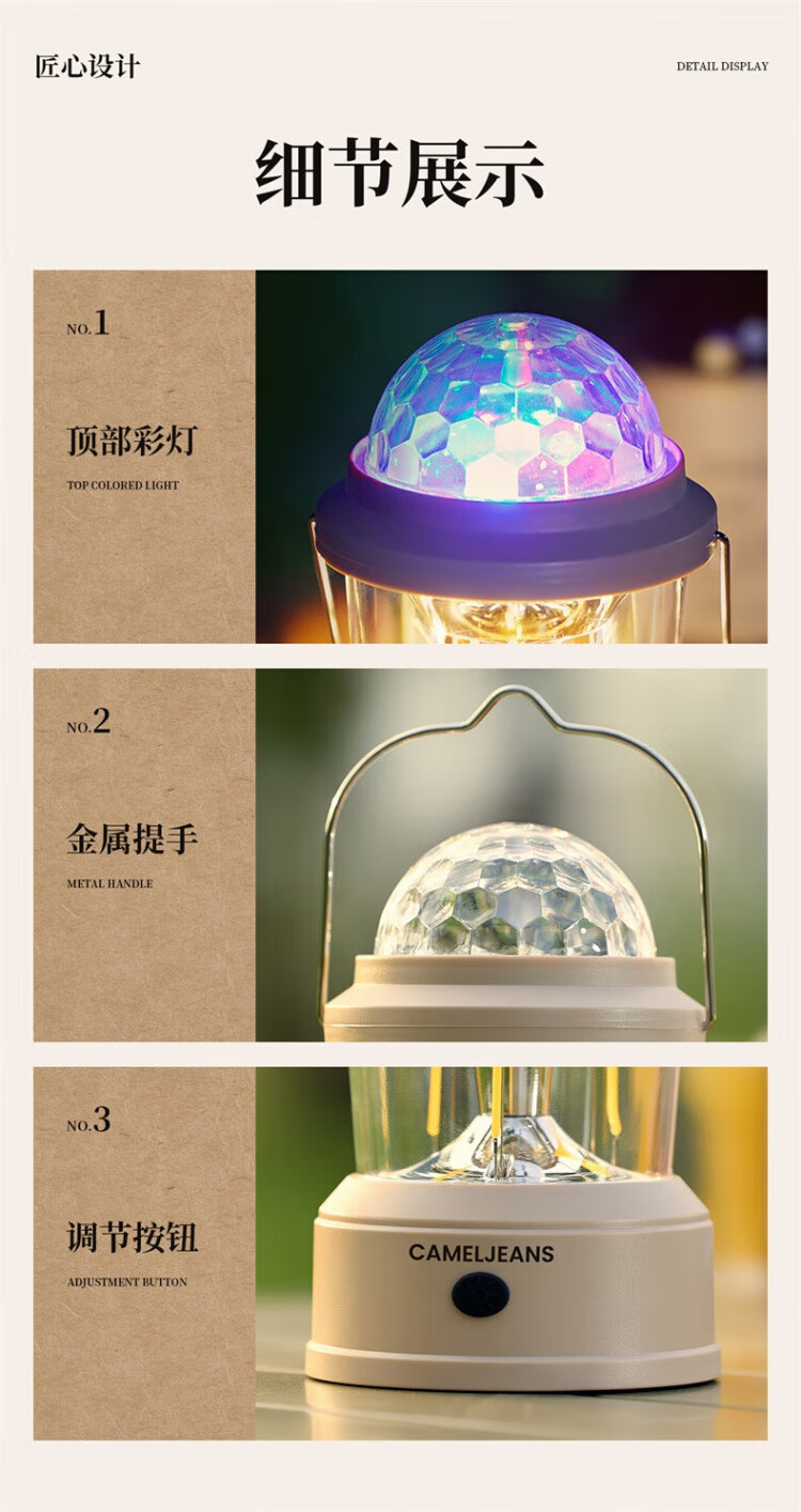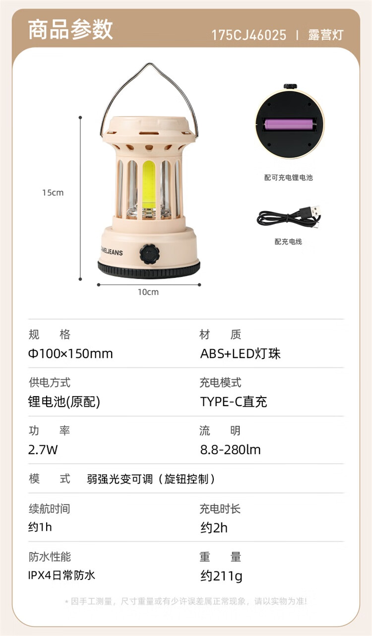 CAMELJEANS户外露营灯多功能照明长续航充电可移动帐篷灯手提马灯 露营灯-米色-175CJ46025