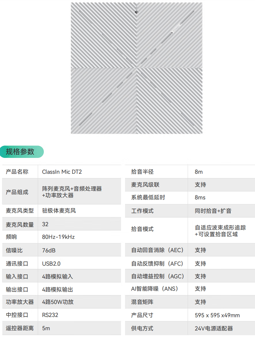 型号:MS20A 1.通过私有协议,支持输入通路至输出通路的数字音频矩阵自由配置 2.4 路单端或者2路差分带 AEC 功能的麦克风/线路输入 3.4 路单端或者2路差分麦克风/线路输出 4.可配置 USB 音频通路 5.通过 RJ-45 连接器 A2B 级联扩展输入/输出接口 6.通过直观的软件对信号路由、混音矩阵、回声消除(AEC)、反馈抑制(AFC)、自动增益控制(AGC)、深度神经网络降噪、动态范围控制(DRC)、均衡器(EQ)等信号处理模块进行配置 7.Line In AD 分辨率:24 bit 最大输入电平:6 dBu 输入信噪比(A 计权):99 dB 输入阻抗:10 kΩ 输入频率响应:20-20k Hz (+0.1/-0.2dB)