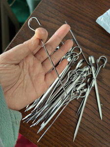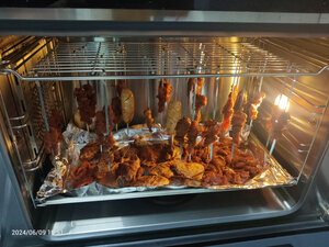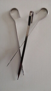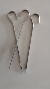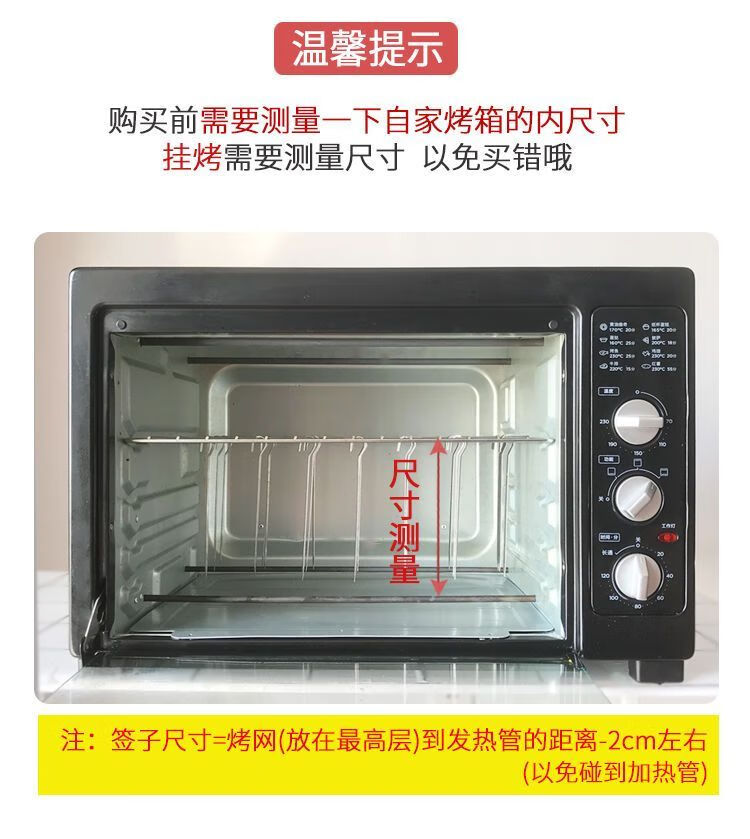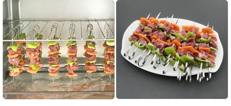 很好用啊,刚才烤箱里长度刚刚好,,吊着烤很方便,吊着能烤的数量多,不像以前横着放就放个10多串,很好穿,吊着也不掉落,是304的材质啊,拿回来用手摸也没有黑灰