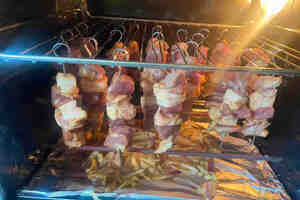 小签子串小串,挂在烤箱里面刚刚好,吊着烤五花肉可以让油脂充分的沥出,肉吃到嘴里不腻,再放点彩椒互补下口感,完美!