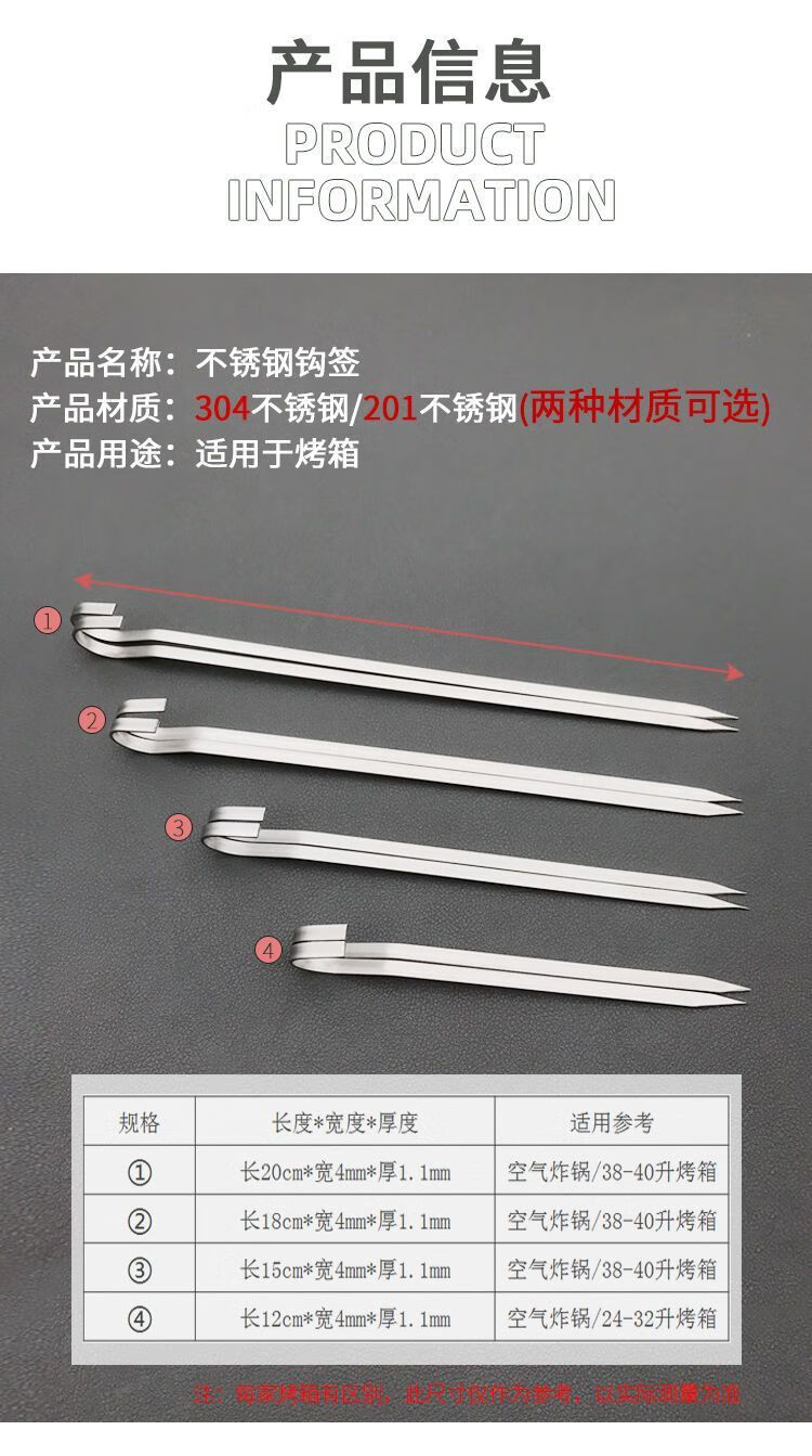 室内室外:烤箱用的,吊在烤网上的 用料材质:304,具体没有专业去测 适用人数:50只,两到三人是够了的 重量大小:15cm长,从吊钩根上算起。实际能用的在12-13左右 热源类型:烤箱用的 便携性能:扁的,头比较尖锐,要注意别扎到 包装袋如下图,简约风!