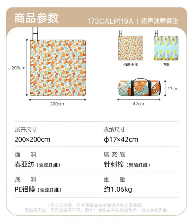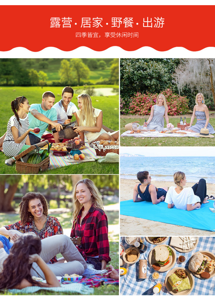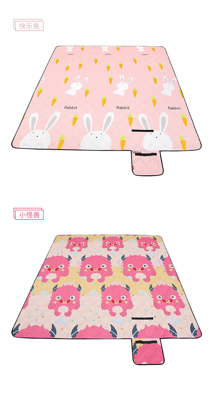 便携性能:收纳方便,体积不大,很轻。 展开类型:和描述的一样,2m乘2m,方方正正,很大。 容纳人数:最多坐4~5人没有问题。 适用场景:野外草坪,野餐,亲子游戏。 防水效果:试试还不错。 透气效果:看着很好,还可以。 外观效果:色彩对比鲜明,图案搭配非常和谐,大人和小孩都很喜欢。