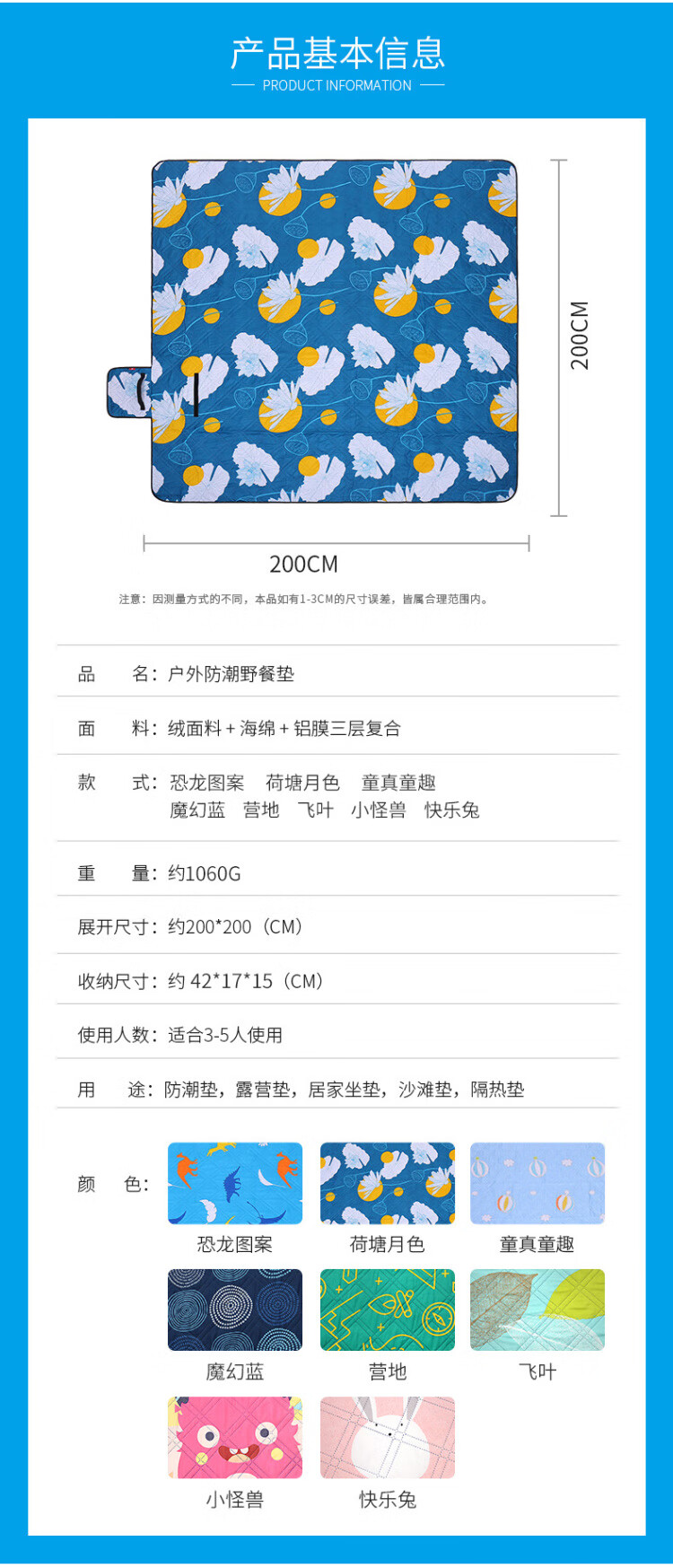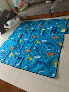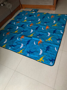 给孩子特意选的蓝色恐龙🦕图案,还不错,可以一家人👨👩👧👧一起用,5到6个人也没问题,用起来很方便哦,性能也是棒棒哒,总之呢孩子很满意,可以放在帐篷里用,也可以当野餐垫用,出去玩的时候放车里也不会占地方