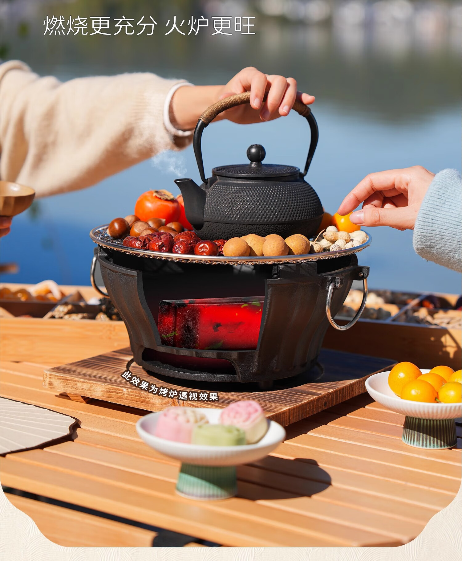 原始人围炉煮茶烤火炉套装烧烤炉子家用室内冬日户外碳炭器具全套 铸铁围炉【烤网+5斤碳+铸铁壶】