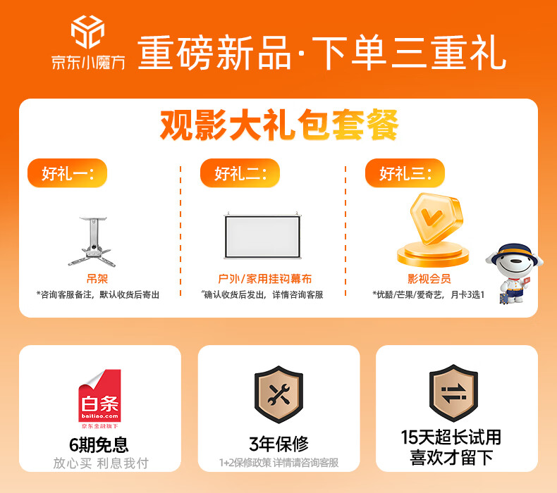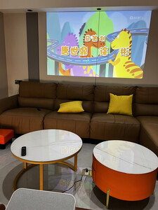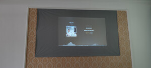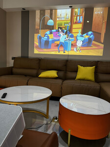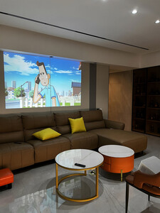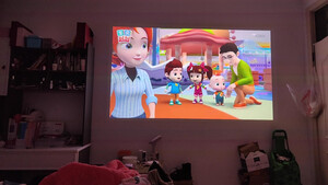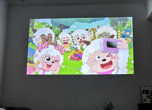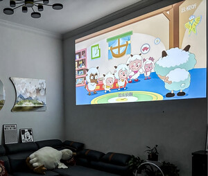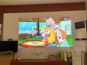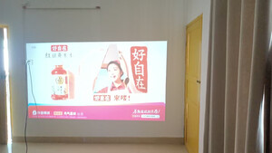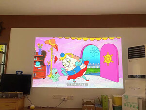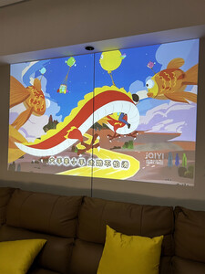 之前买的不太行,这个一到我就试了,直接在客厅投的。画面可以投屏的特别大,还很清晰,这个就很赞了。待会我就把送的幕布用上,中间就不会有一条线了。果然是一分钱一分货啊。
