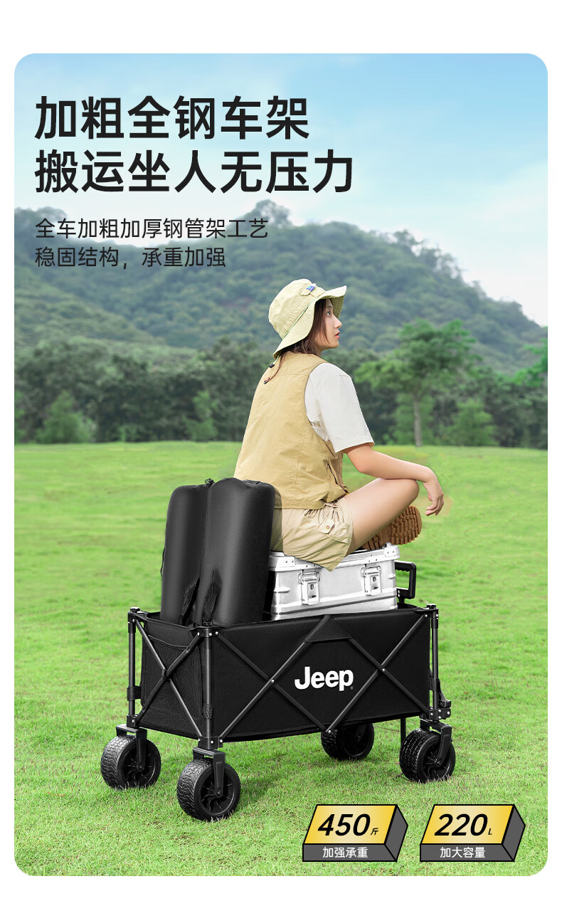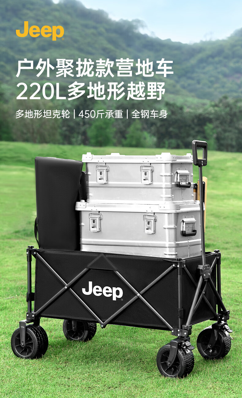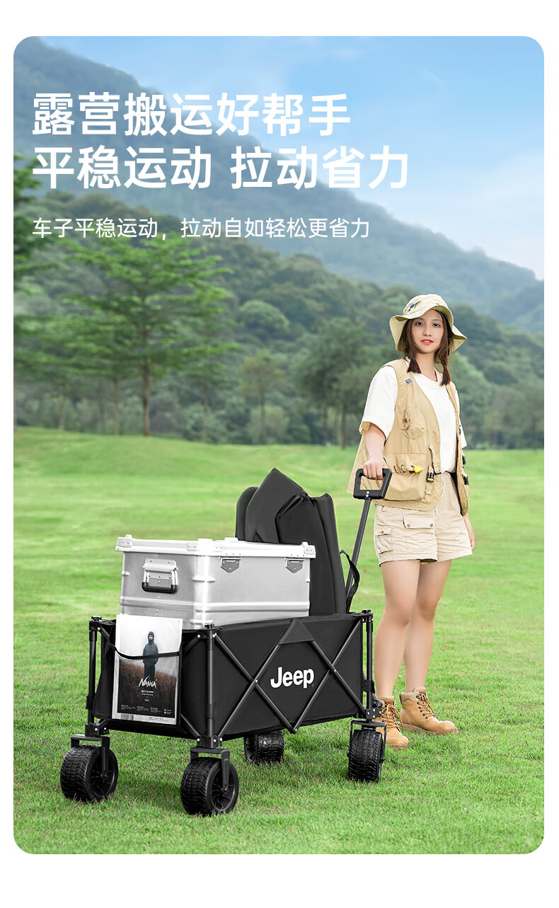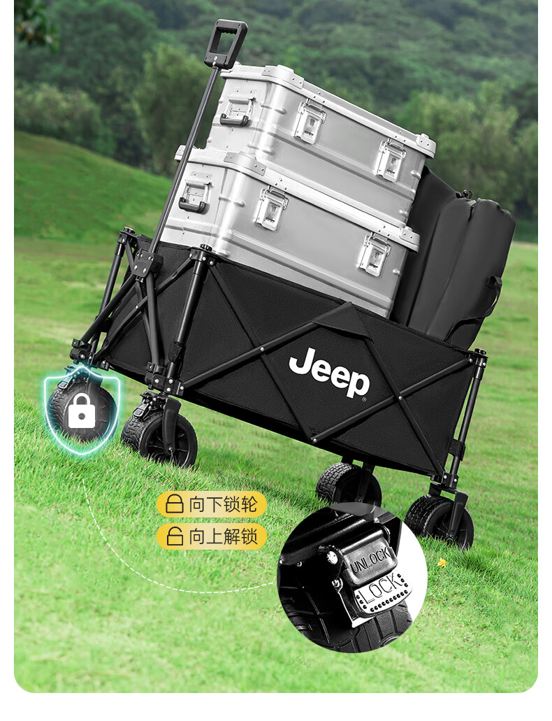 JEEP 户外露营折叠车野餐车营地车露营装备便捷拖车推车购物 旅游买菜 聚拢款坦克轮黑色+碳钢桌板