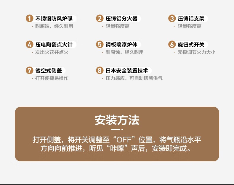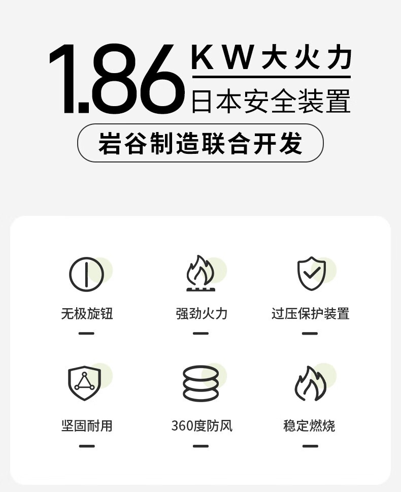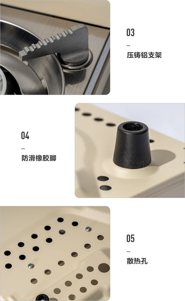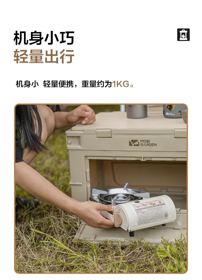 产品做工:铸铝架子、不锈钢罩子、烤漆炉身,功能与美观平衡的好炉子 火力大小:火力3人锅足够,防风(点火要按压罐子),可以精准调节火力大小,户外烹饪小能手 适用场景::配了盒子,安全便携好收纳