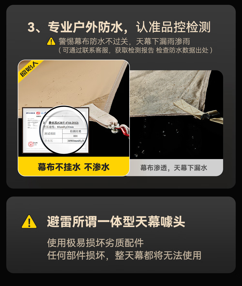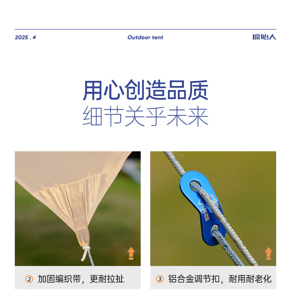 原始人的天幕不错 性价比真高 用料扎实做工好 出去用过一次了忘拍照了 使用感受就是天幕一定买大的 用起来真爽 沙滩上好多原始人产品 必须给好评