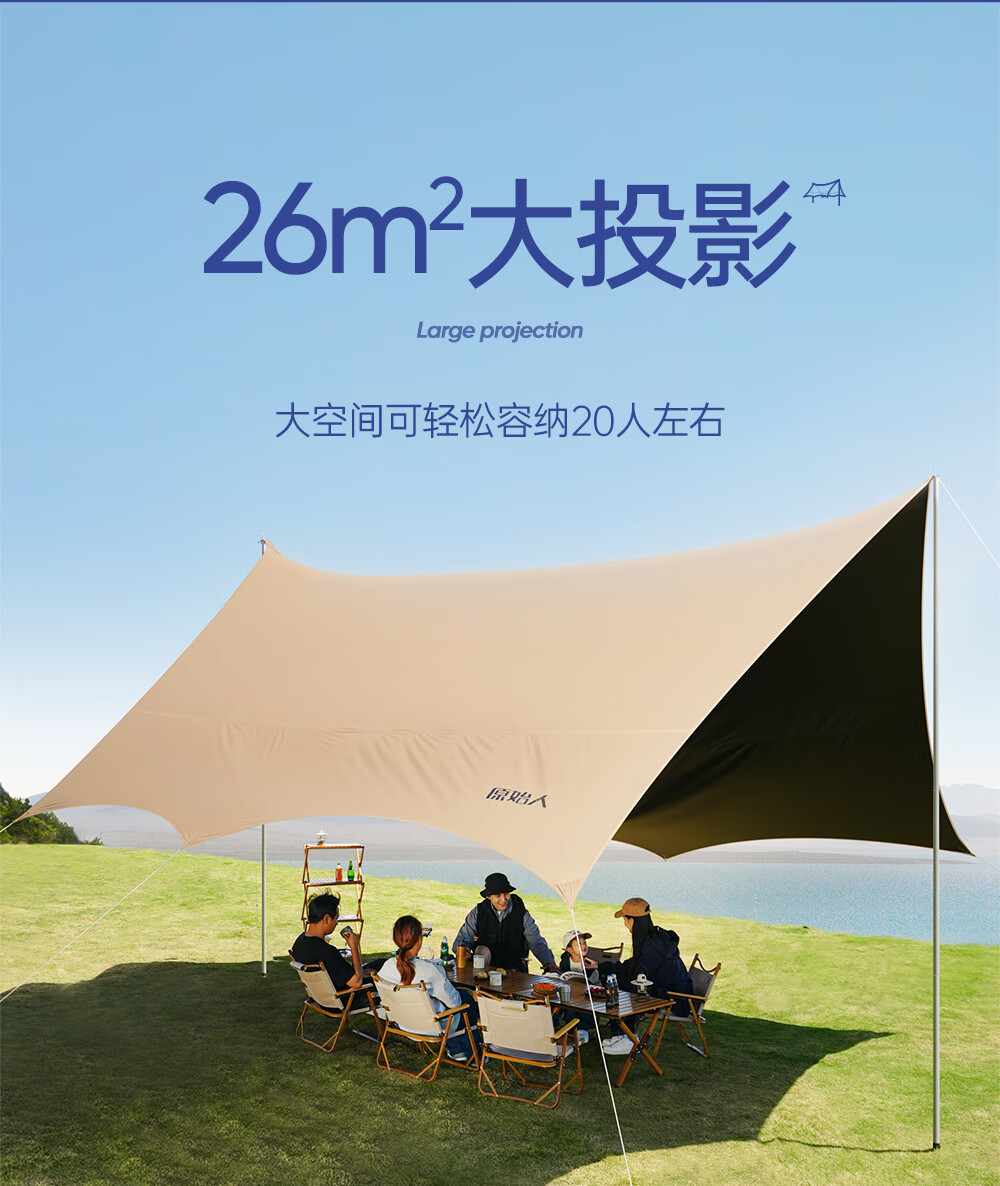 原始人 黑胶天幕帐篷户外露营网红野营遮阳棚野餐桌椅防晒八角蝶形 天幕26㎡奶咖+加大号钛黑胶帐篷