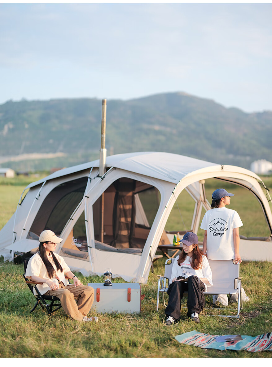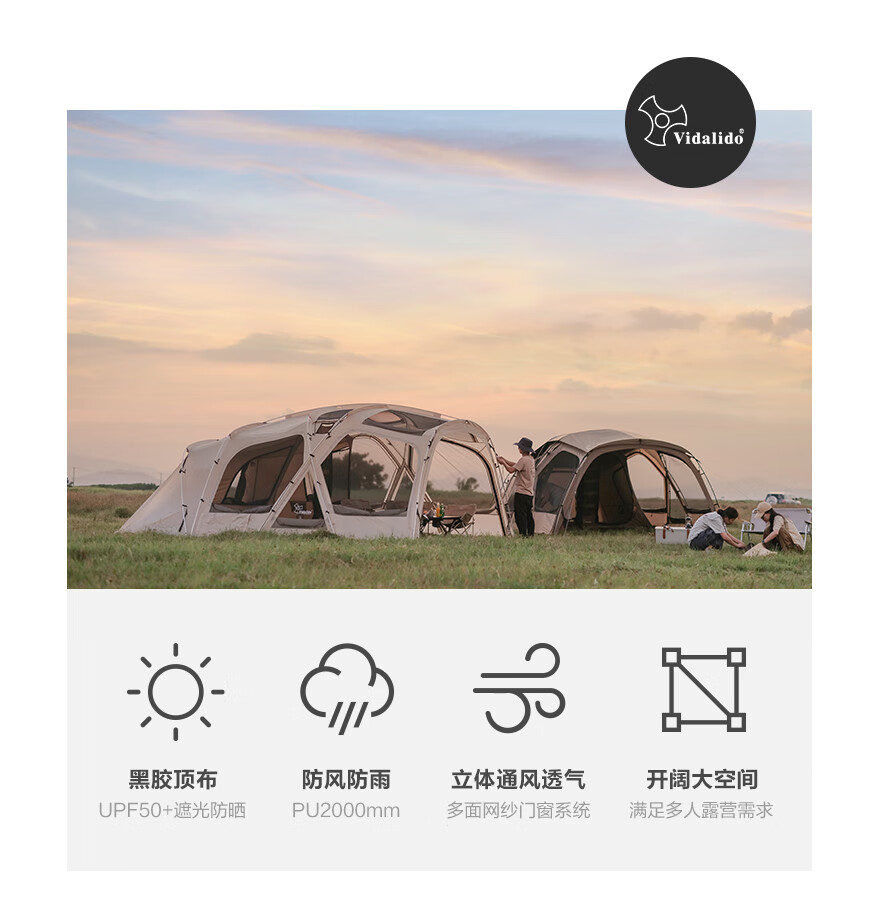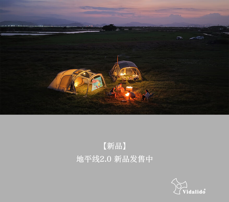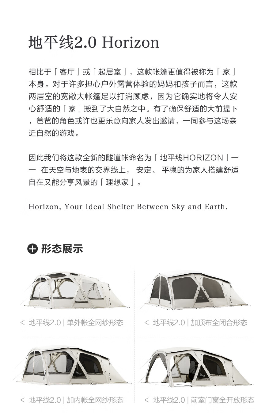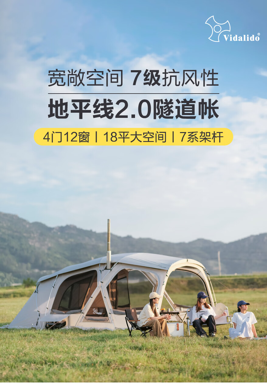 在网上看了很多测评,然后最终还是选择了维达利多的地平线,在这里给大家分享一下我的使用感受,先说优点:1,真的很大,特别是客厅,直接还可以搭一个小帐篷在客厅。2,材料和做工都非常扎实。3,交叉杆设计和外账倾斜的角度,使得帐篷增加了不少的抗风性。4,客厅的两个大天窗,应该是很大的亮点,通风透气。5,雪群带有专门的固定孔位,这个小细节很棒。6,线位带可以拆除一边收拢在一个小袋子里,这点很贴心,免得过路绊倒。7,天幕侧面多了一块布,既可以遮阳又可以挡风,和小的飘雨。然后再说说我觉得可以改进的地方:1,为了抗风设计的斜面坡度,这样导致内帐一面也是整个倾斜的,内帐空间就显得不足!2,内帐链接外帐的挂点太少,这样导致内帐看着不是那么规矩,有点小拉胯。3,整个帐篷的挂点都太少,客厅那么大就一个挂点,其实就一小挂钩,一小块布的事,应该不难改进。最后就再来说说搭建,两个人搭建,还是蛮容易的,就是最后屋脊杆太高了,没找到方法,下次肯定还会缩短搭建时间的,这是我使用一次的感受,希望能给友友们一点参考价值。