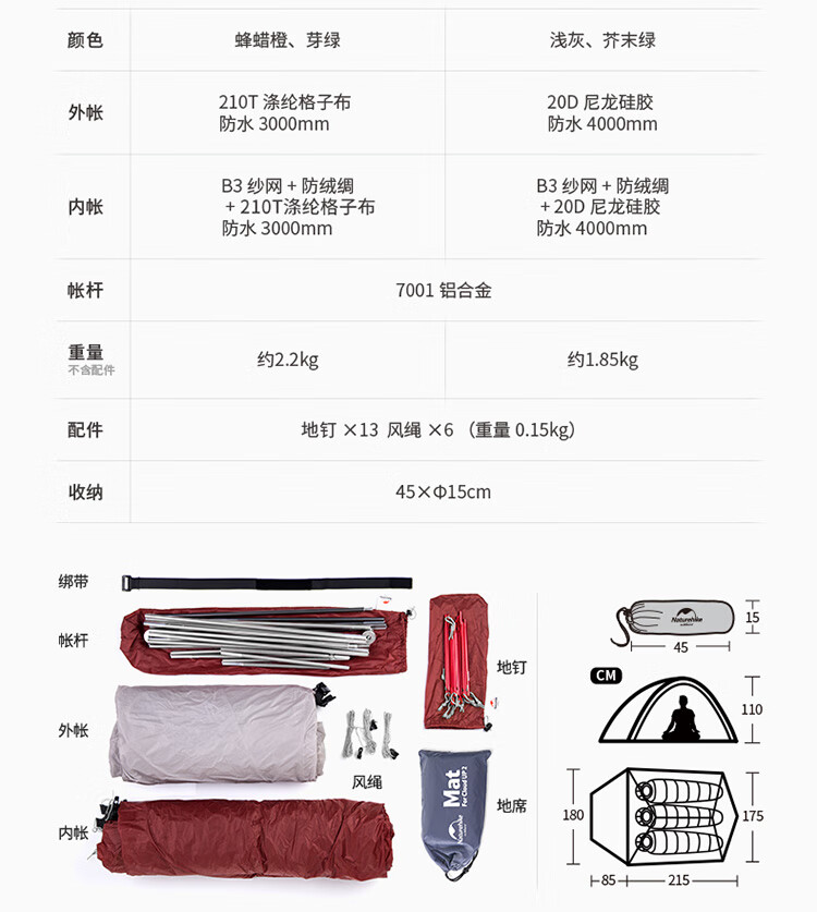 重量只有1.8kg,东西比较满意 便携性能:普通帐篷重量在3-3.5kg,差别还是很大 展开类型:比较简单 防水效果:需要后面的野外归来再做评价,各位可以关注我的追评。