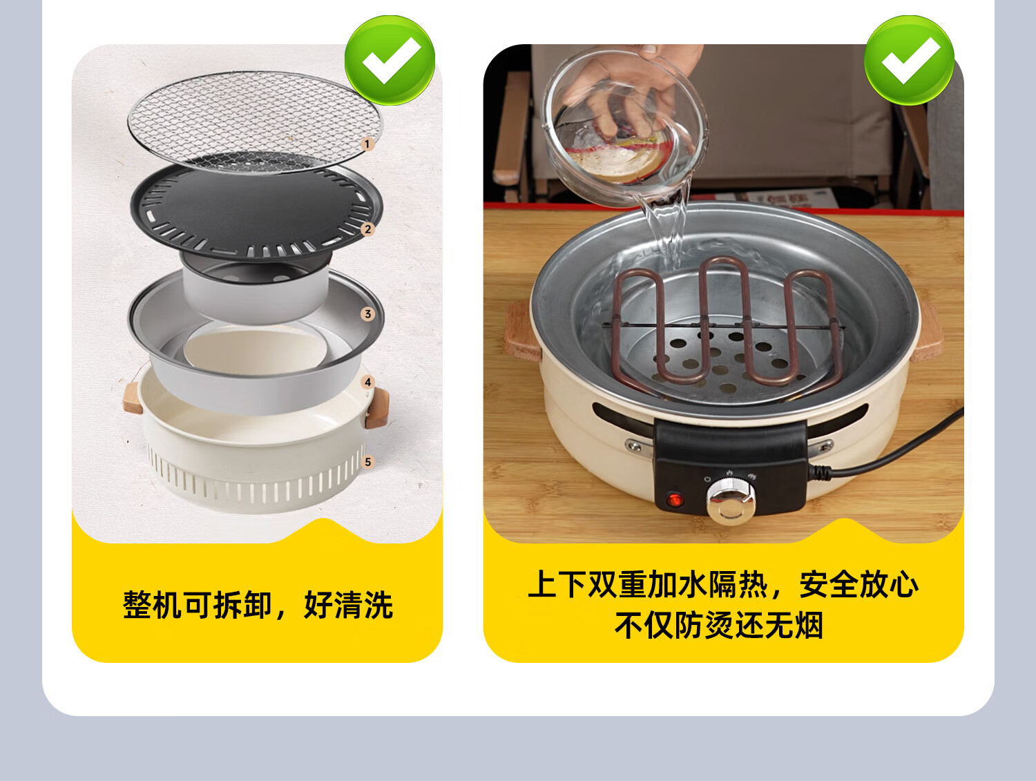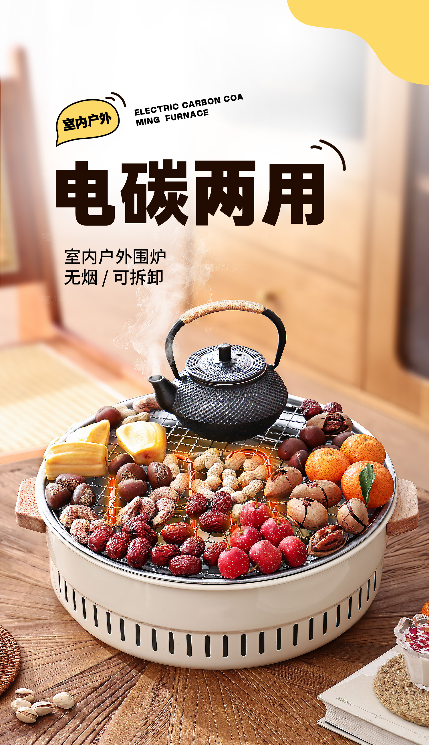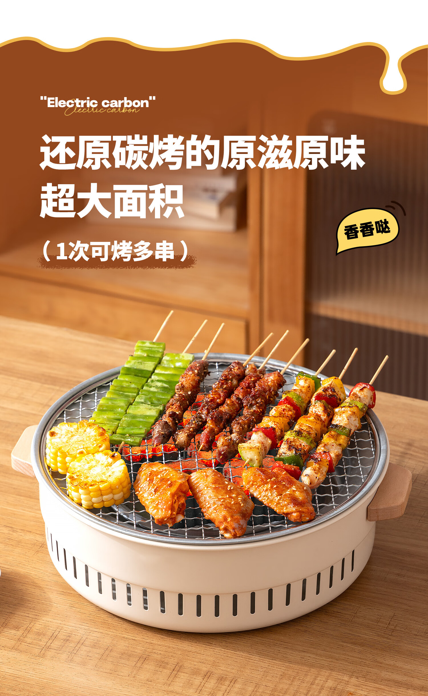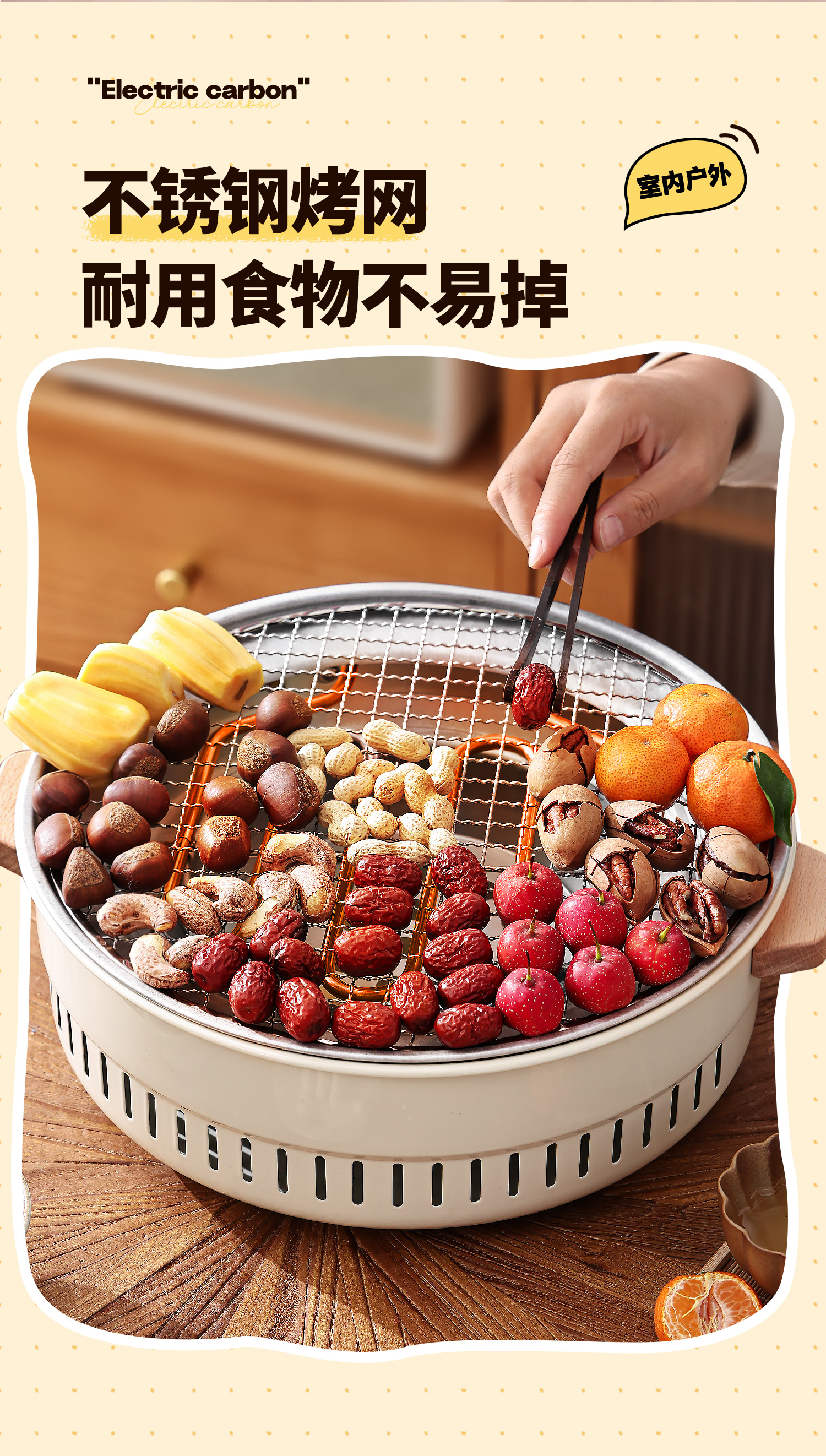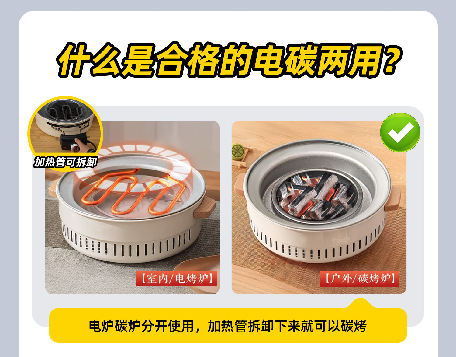 之前买了一家别加的电碳两用的,居然是不可以拆卸,碳就放在加热管下面烧,试都不敢试,收到赶紧退了。这家看到试整机可拆卸的,价格也不贵吧,想着再买一次试试看,没想到还可以,能拆下来分开用,也好清洗。烤了点红薯吃,烤的也非常的快,性价比很高,这款可以买!