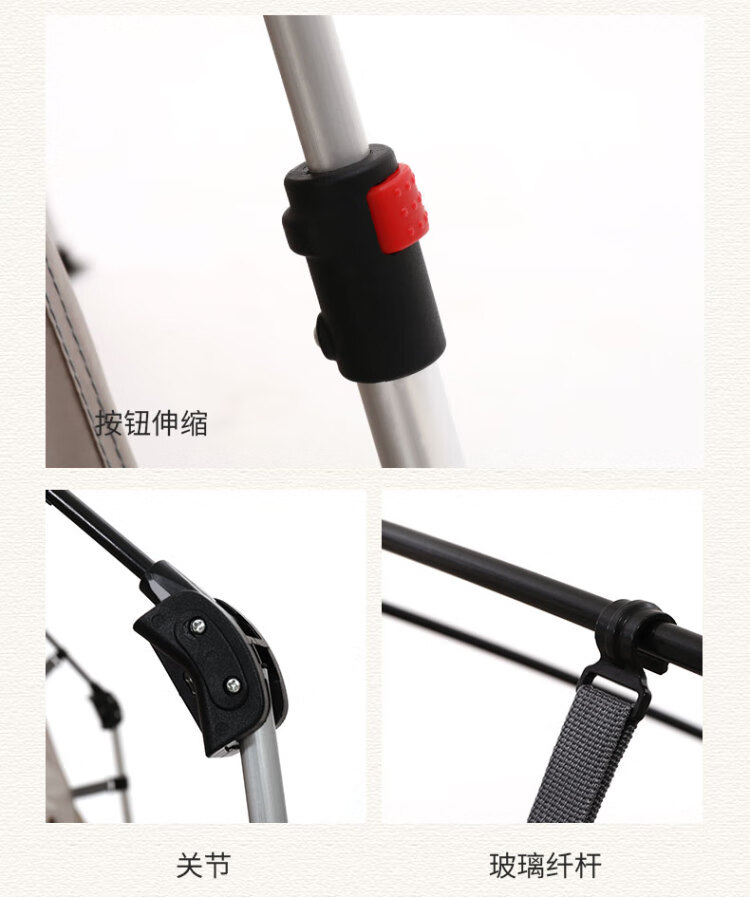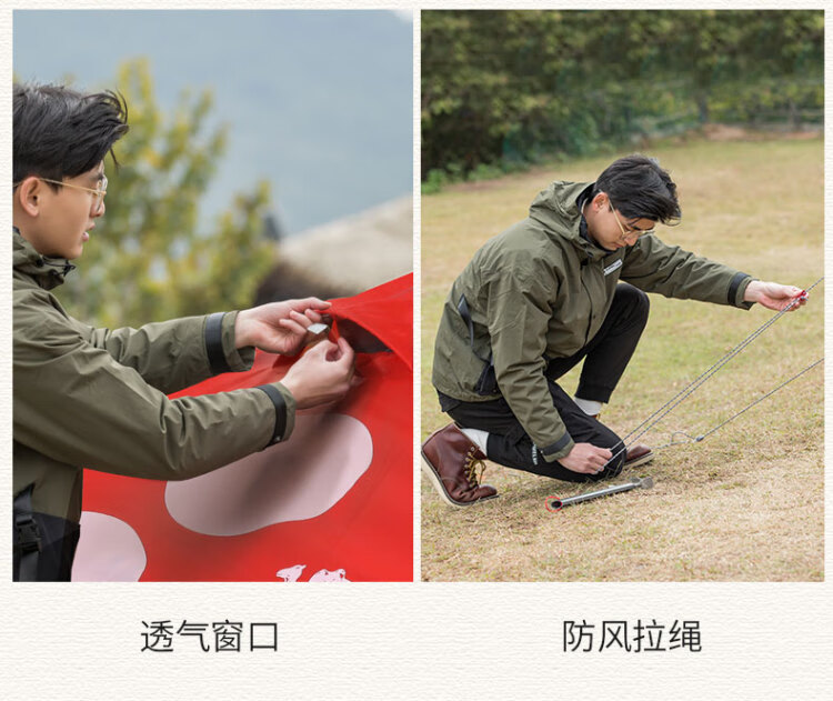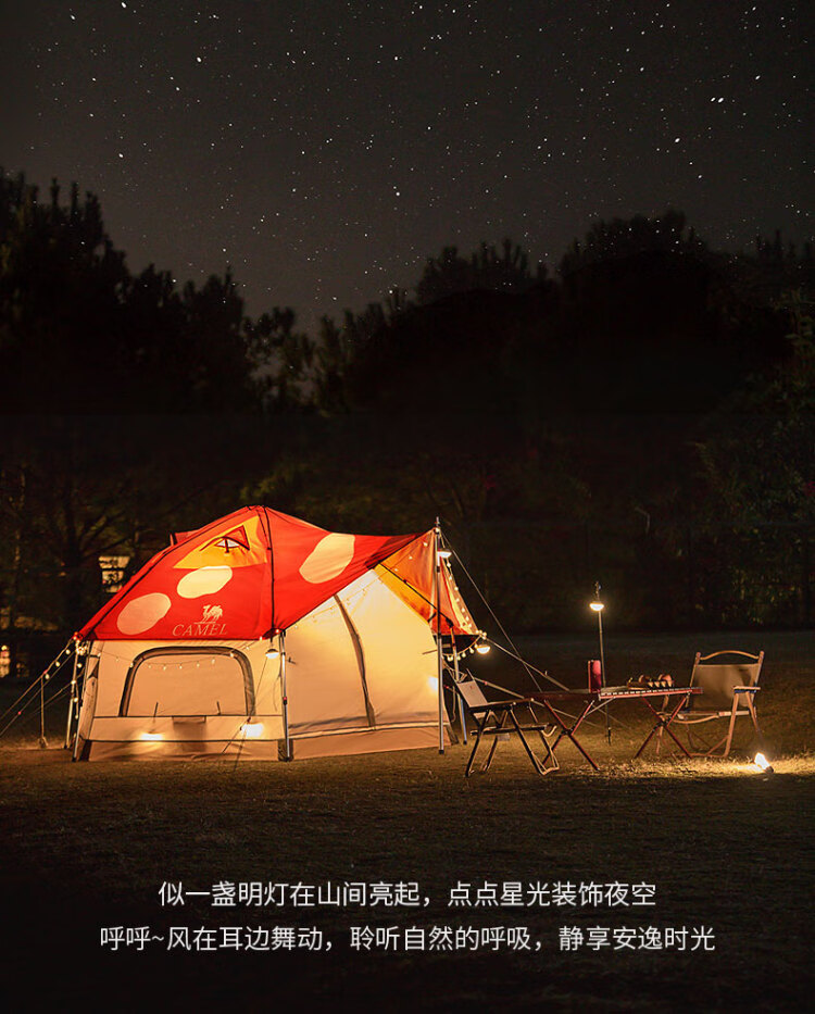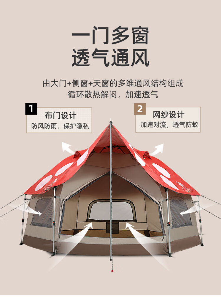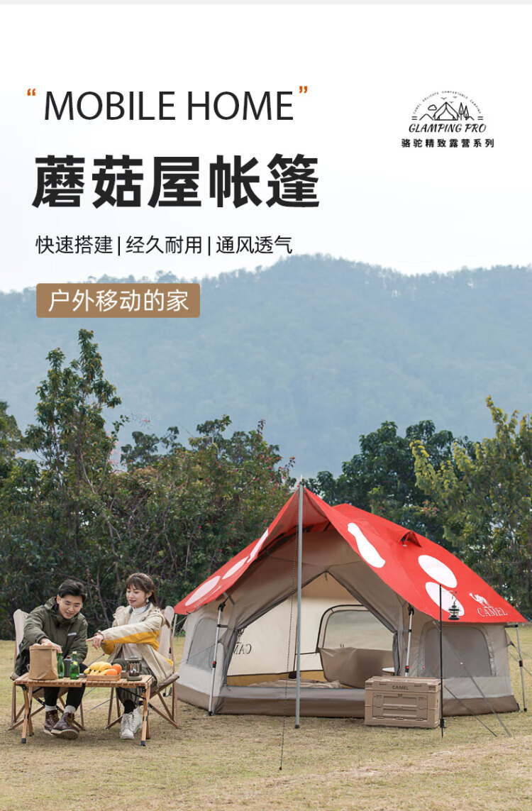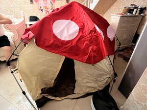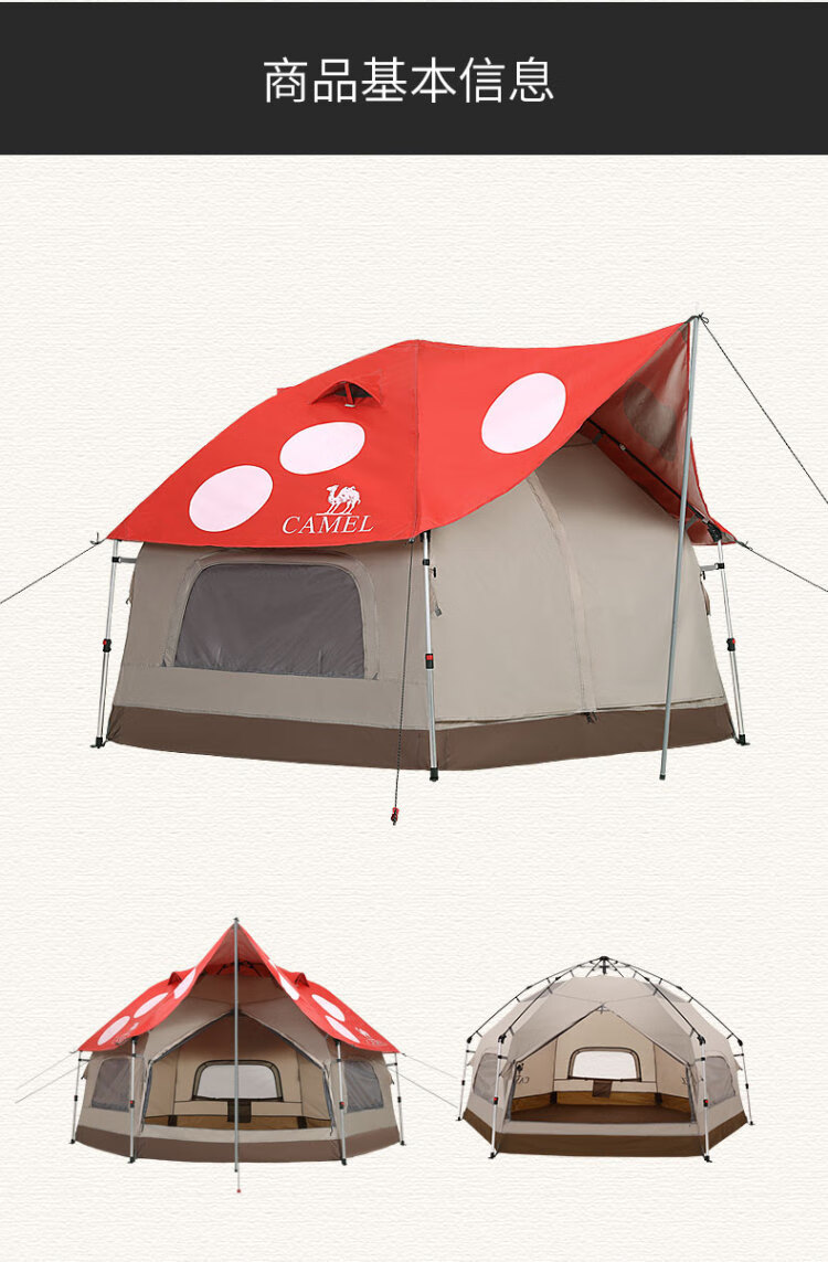 买了半个月今天才打开,首先色差太大,颜色太丑,除了红色蘑菇顶,实物跟图片简直就是毫无关系,要是早点打开肯定会退掉的,而且帐篷也太大,不适合家庭用,是一次很不满意的购物体验。非常悔恨为什么没早点打开验货。