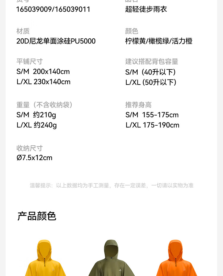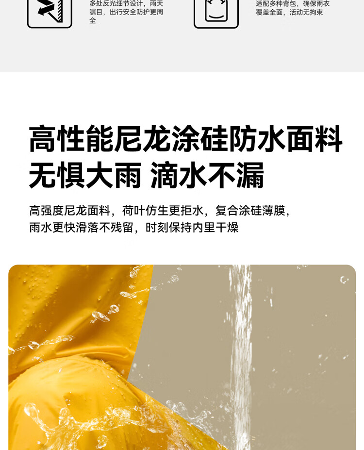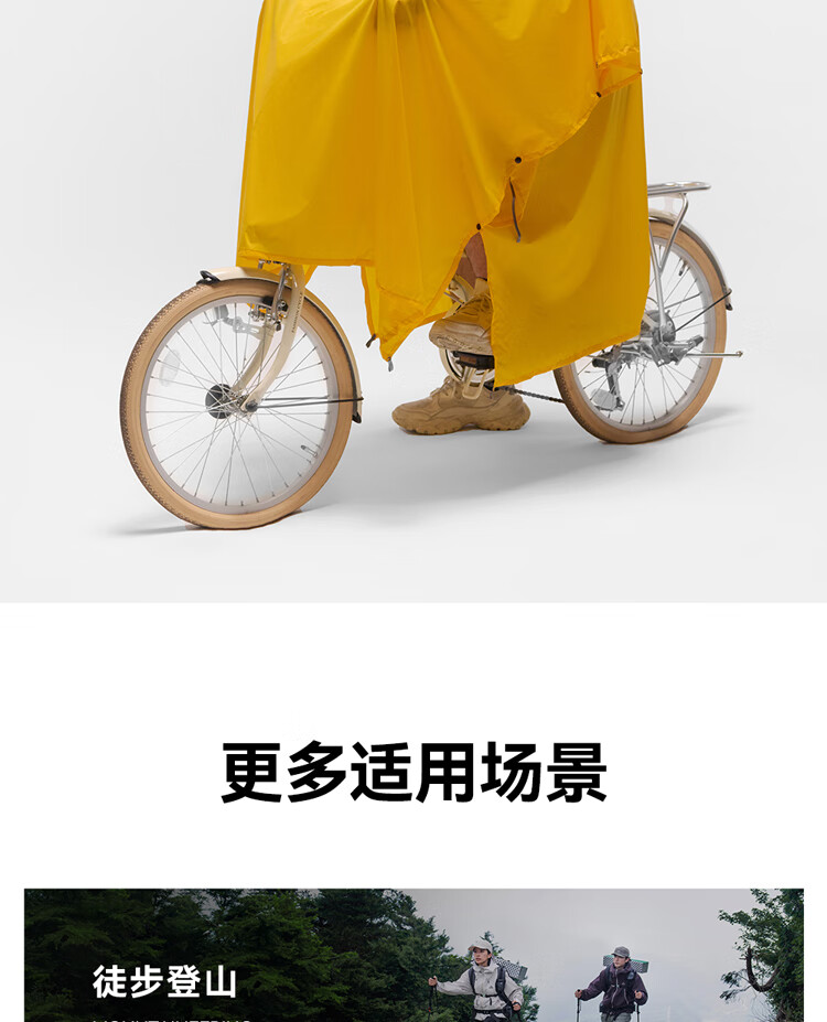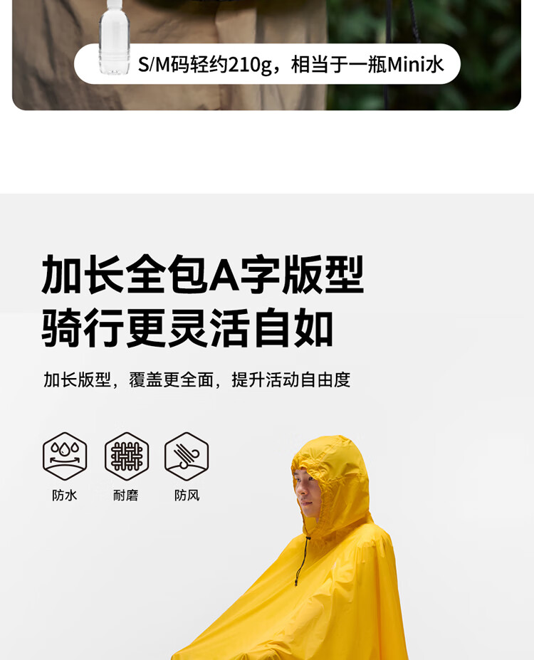 小巧,轻便,防雨不错,长宽还是稍微小了点,穿上后脚到腿肚下,裤腿及鞋都会湿,上身手擘只能到腕部前面,手腕遮不住,要是能长度加多三十厘米,宽度增加三十厘米就好了。