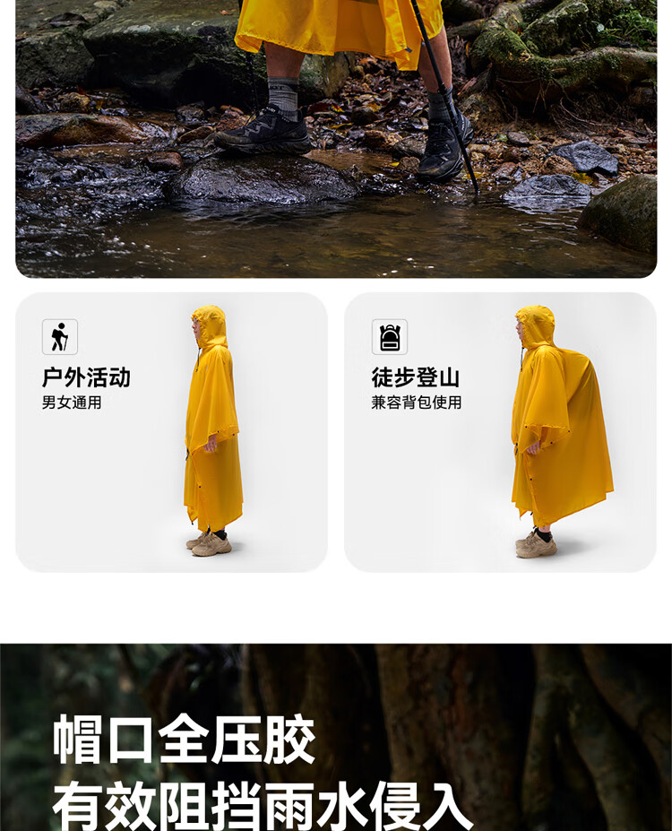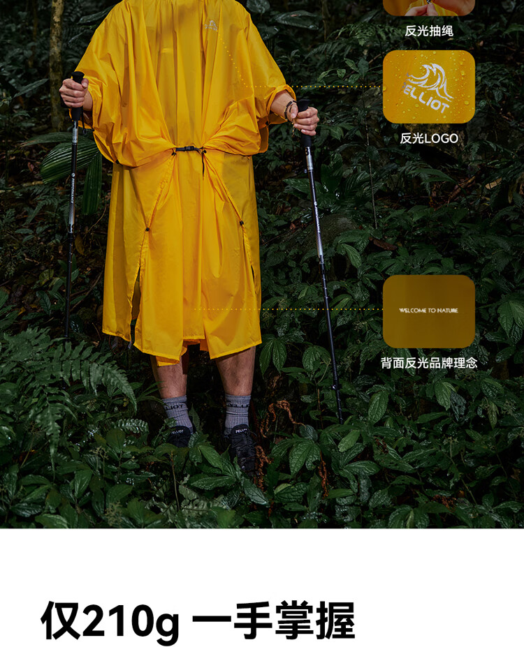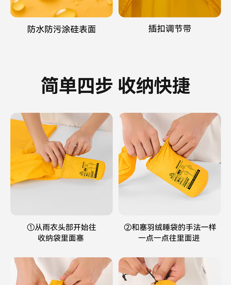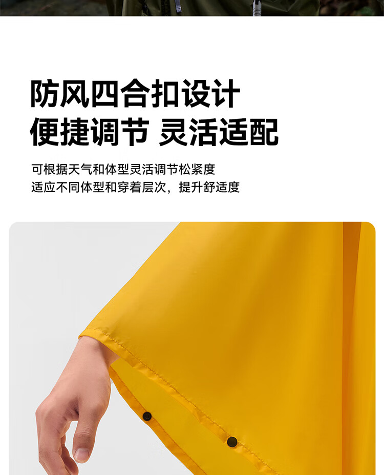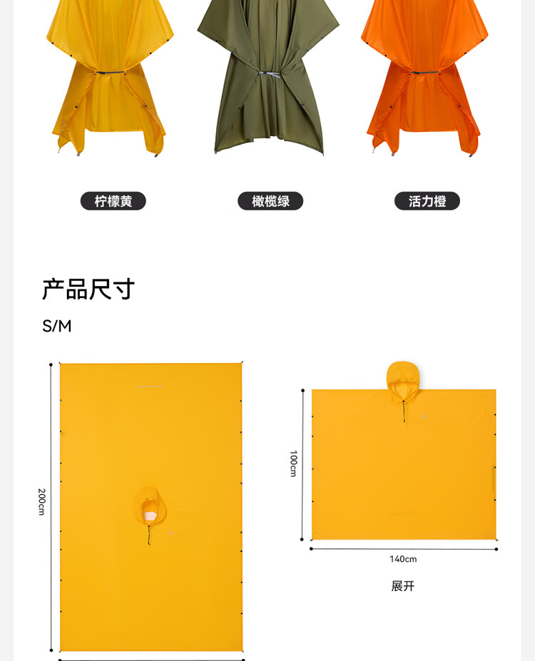 小巧,轻便,防雨不错,长宽还是稍微小了点,穿上后脚到腿肚下,裤腿及鞋都会湿,上身手擘只能到腕部前面,手腕遮不住,要是能长度加多三十厘米,宽度增加三十厘米就好了。