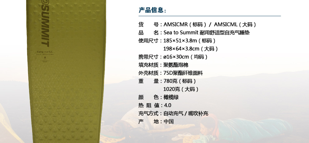 SEA TO SUMMIT澳大利亚户外徒步探险露营快速充气型海绵睡垫野营垫/热阻值4.2 橄榄绿锥形标码(183 x 51cm )