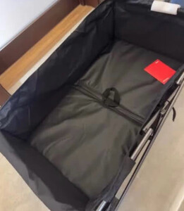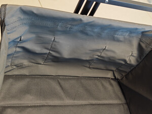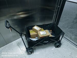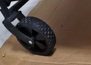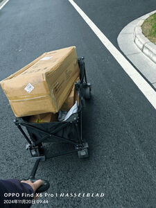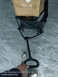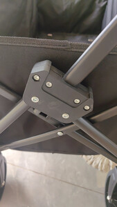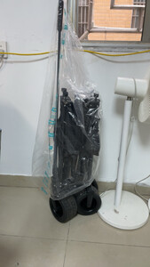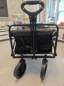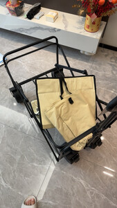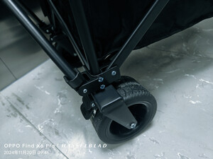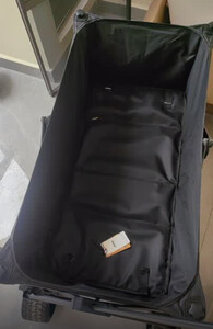 黑色的露营手推车还不错啊,承重150斤肯定没问题,车架和轮子看着也还可以啊,轮子挺大的,过沟沟坎坎的方便,就是没轮子刹车,黑色衬布很单薄,很廉价的感觉,两头的衬布看着有点赃,有点磨损发白,看着有点旧呢
