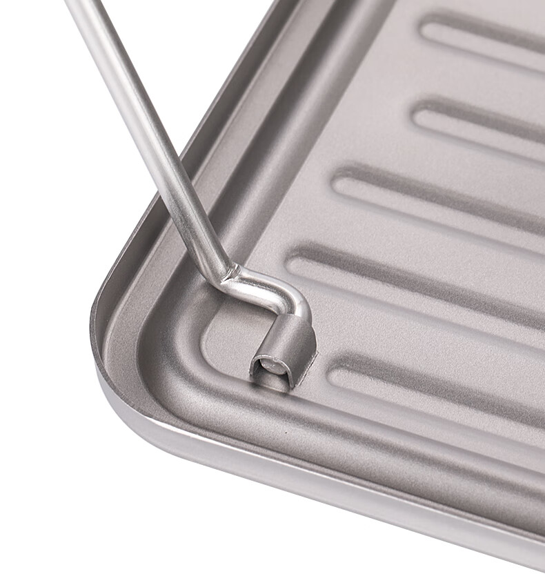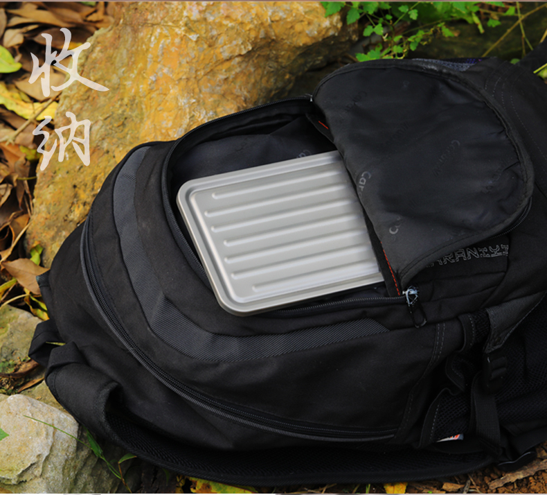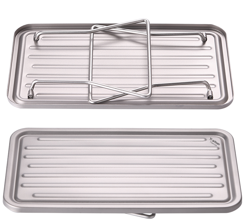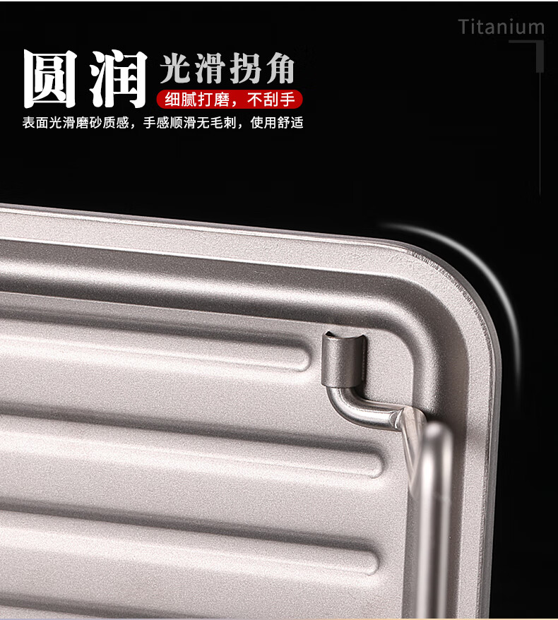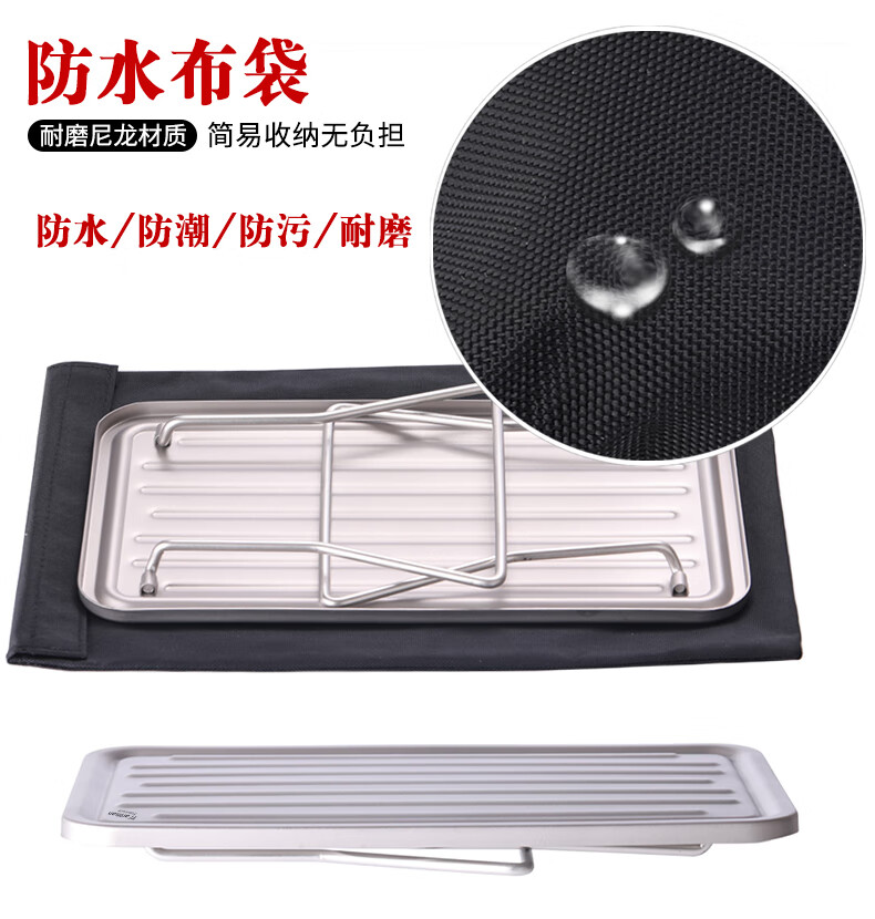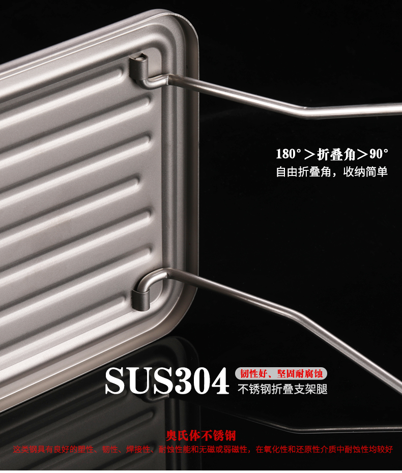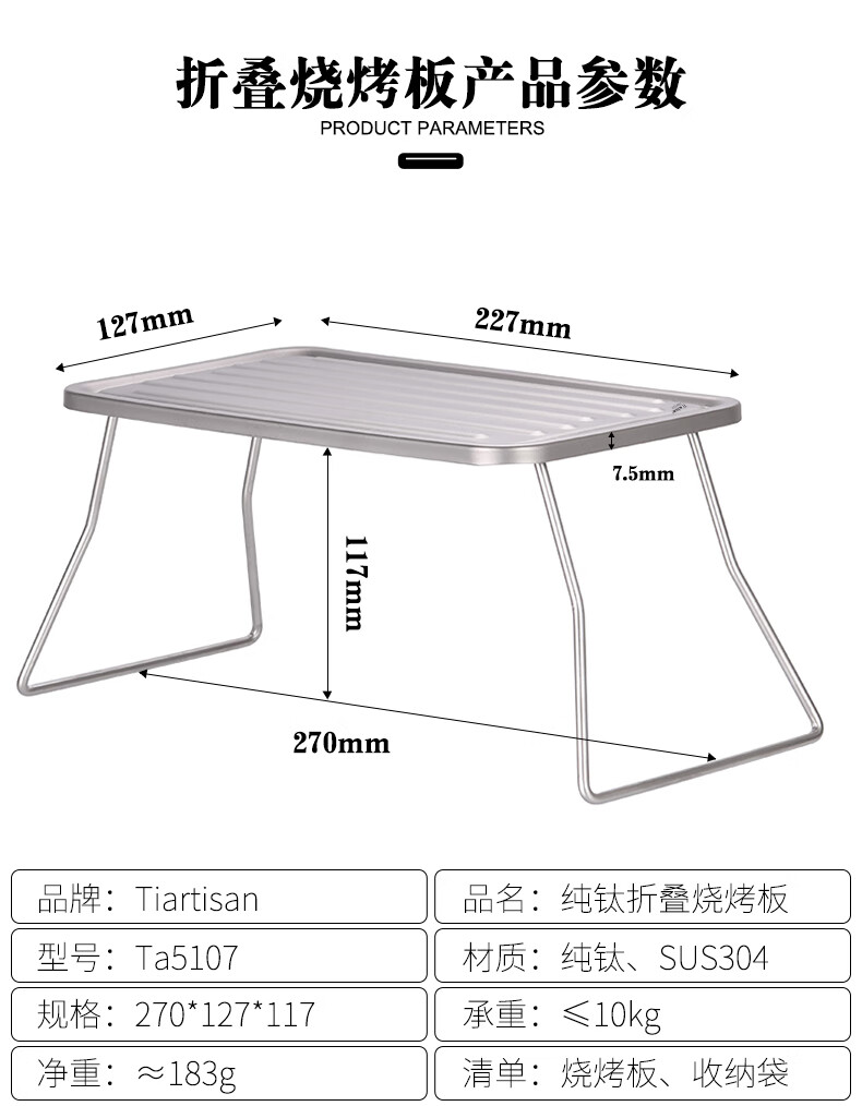 纯钛折叠烧烤板,材质纯钛+304不锈钢,承重≤10kg,桌面长宽227*127mm,高度117mm,净重183克。附送收纳袋,携带方便。