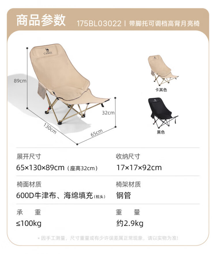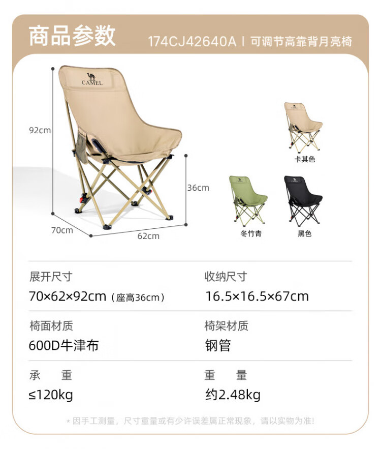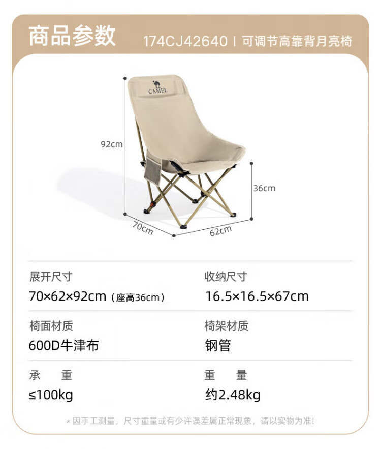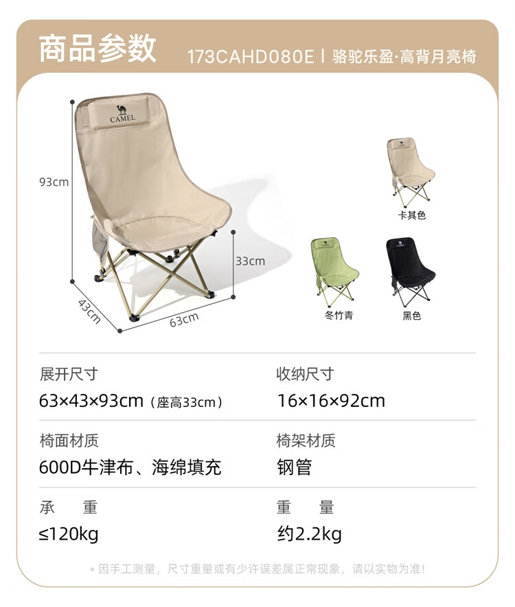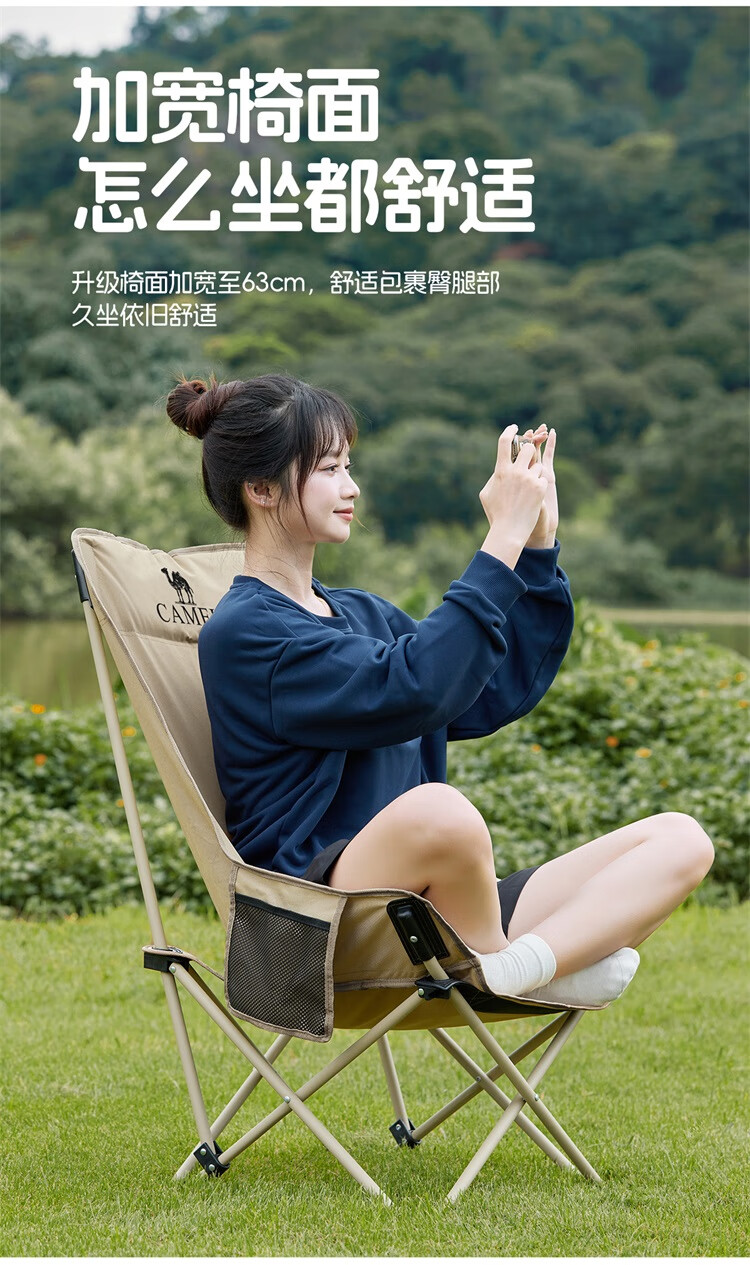 骆驼(CAMEL)户外折叠椅子结实便携式轻露营钓鱼导演凳月亮椅车载休闲躺椅野餐 高背月亮椅 赠收纳袋 卡其色173CAHD080F