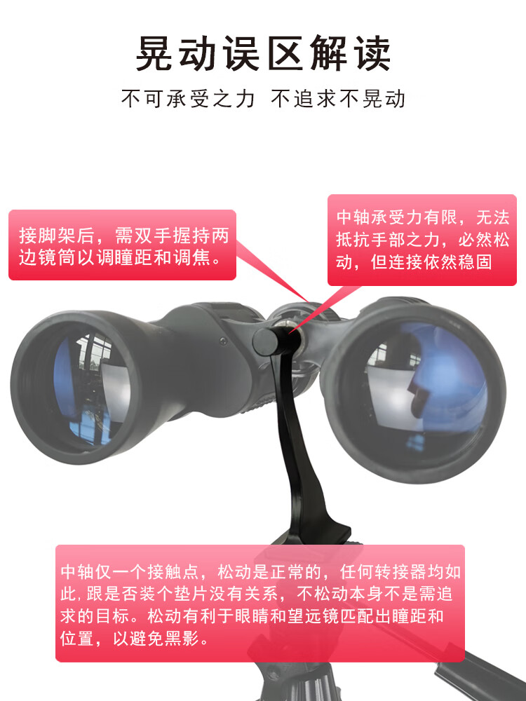 注意:本款支架,主要适用于屋脊直筒望远镜,由于屋脊式双筒望远镜,在使用过程,调节孔距,两个镜筒折叠的时候,中间位置比较小,所有建议采用本款支架,作为双筒望远镜转接器!保罗式的双筒望远镜空间大,加上整体重量尚未重点,建议选择接触面大的,稳定性会比较好!