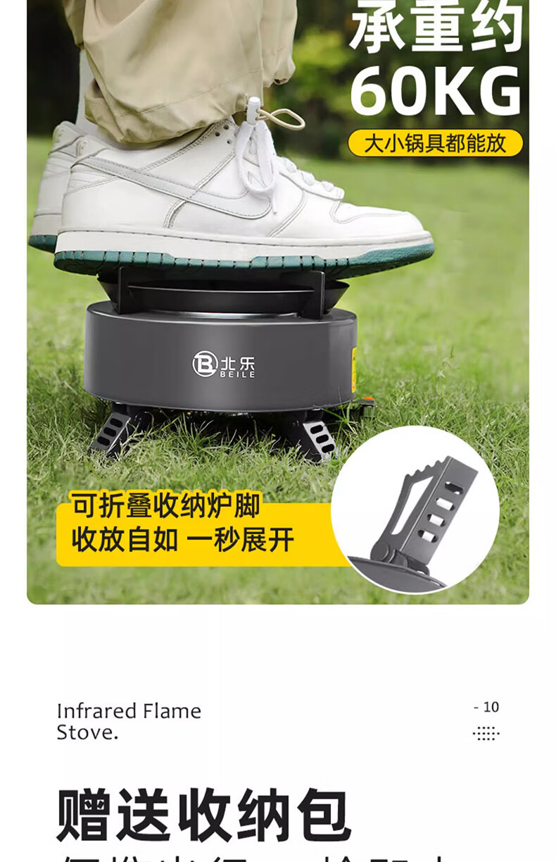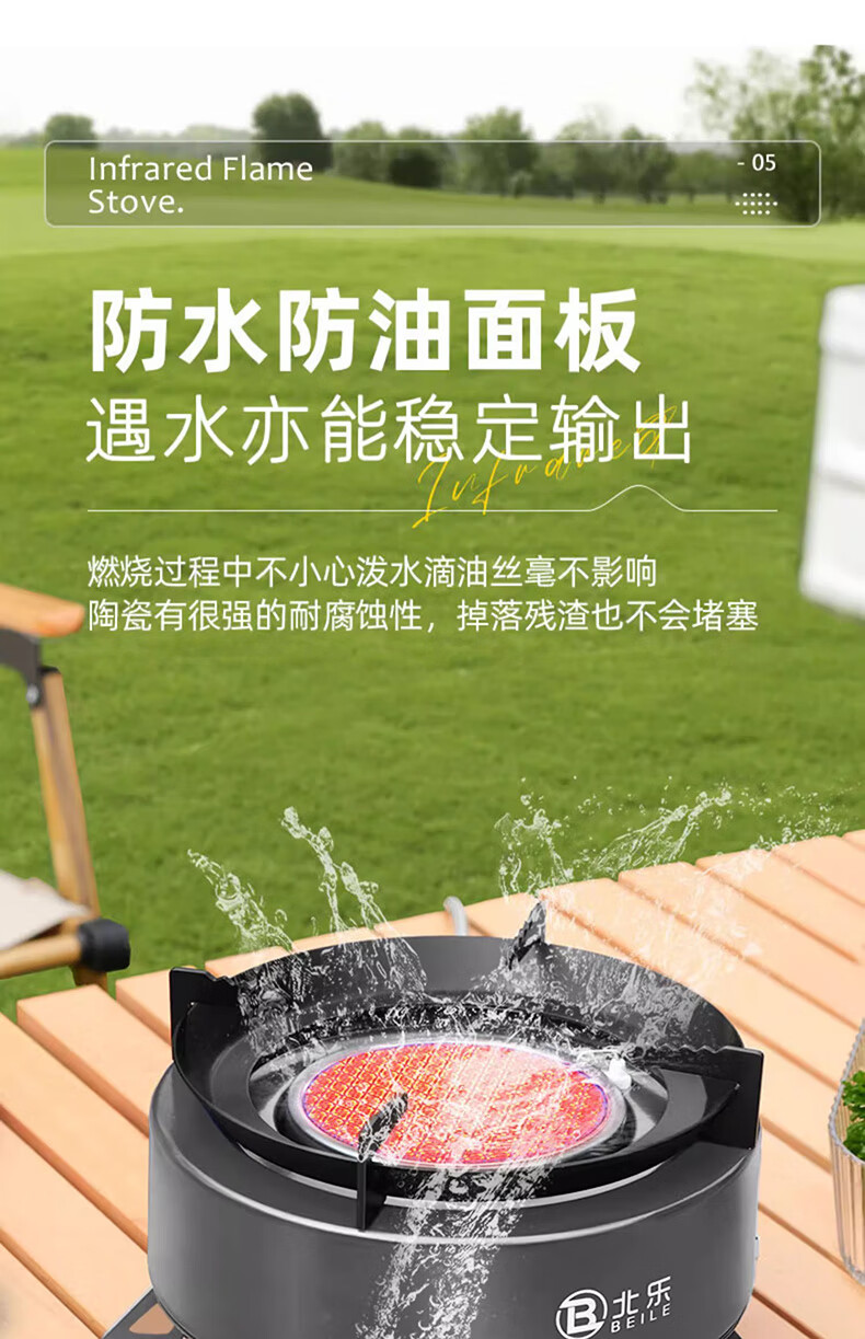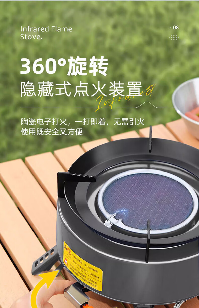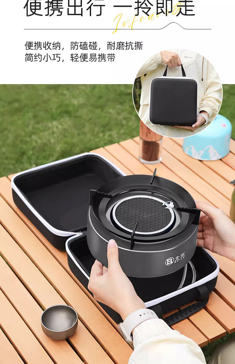 这个红外线野营炉,火力非常大,户外烤肉简直不要太好了,还真的挺方便的,方便清洗,无缝贴合设计,不容易生锈,出去露营也不会担心烧坏桌子,因为这个炉下面是不锈钢,收纳起来也方便,容易折叠,放着车里也不会占很大的位置,也可以用户外那种烧水壶都是可以使用的