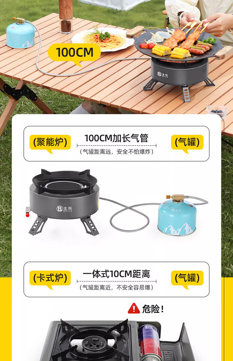 炉子是分体式的,气体和火源分开可以有效保障安全不爆炸。是用了之后才知道的,很节能!宣传没骗人,是挺节能的,之前的卡式炉一瓶气最多用1小时,这个一瓶气可以烧大约2小时,整体来说都很不错