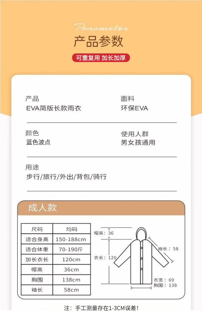 雨衣虽然是一次性的但是质量也不错,不是那种很薄的塑料,不容易坏,感觉可以单出反复使用