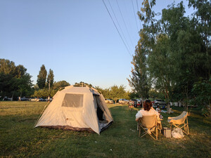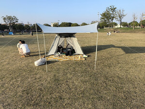 四个人坐在里面带个孩子一点不挤,空间很大。让帐篷是一件就能打开,很方便,但是天幕要几个人一起装,不然装不了。整个在阳光下还是比较舒服的,等娃大点就更好了