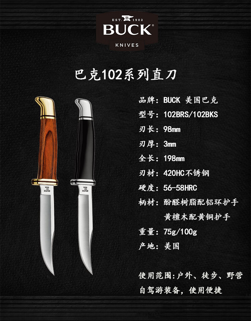 BUCK美国巴克户外装备小直野营战术工具高硬度随身防卫102系列户外 102BKS