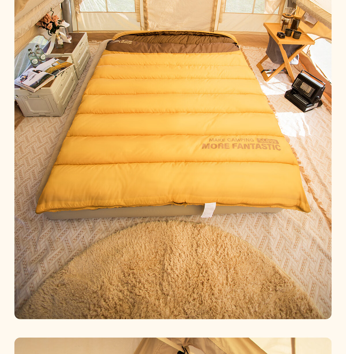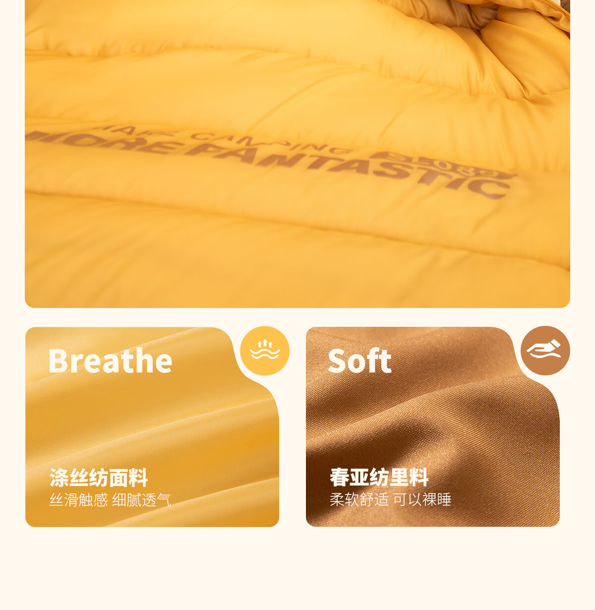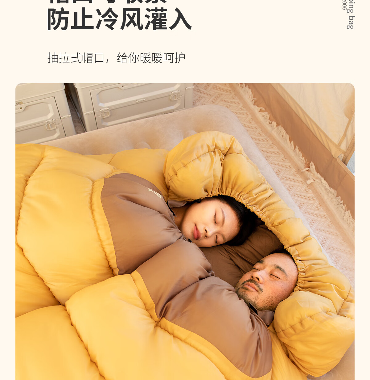 这款双人睡袋完全超出预期!首先,保暖性极佳,夜间低温下依然保持温暖舒适,完全不需要额外加盖。设计非常人性化,采用双向拉链拼接功能,既能独立使用又能组合成超大空间,翻身不束缚,加厚防风帽和底部透气拉链设计细节满分。材质亲肤柔软,无任何异味,内胆可拆洗非常方便,收纳后体积小巧,适合露营携带。性价比很高,对比多家后入手果然没失望,尤其适合情侣或家庭出行,强烈推荐给追求实用与舒适兼顾的户外爱好者!