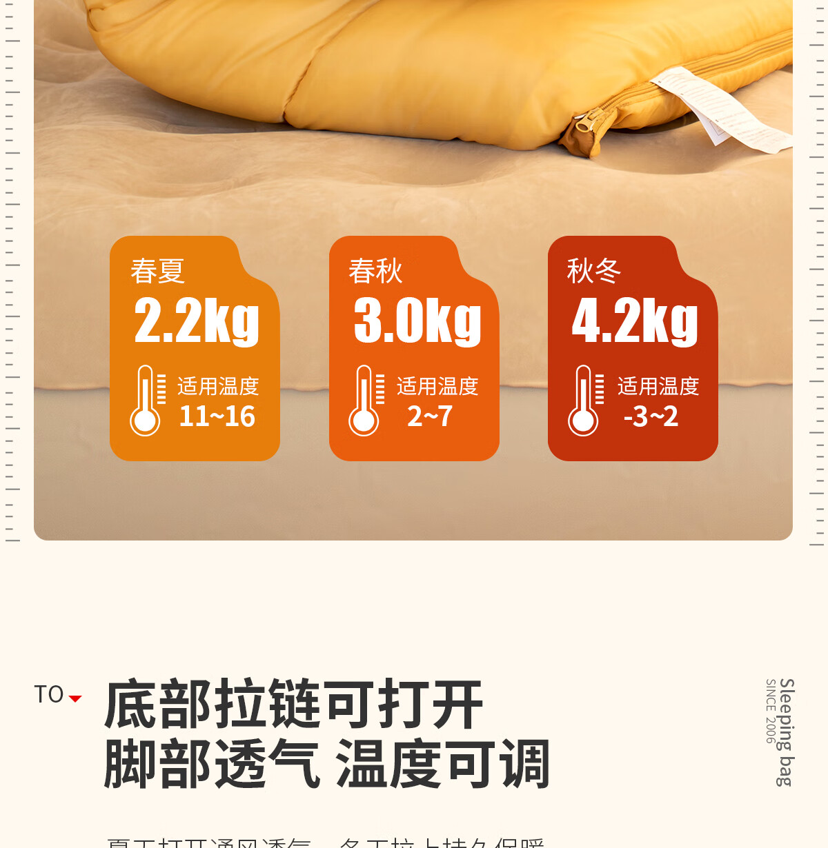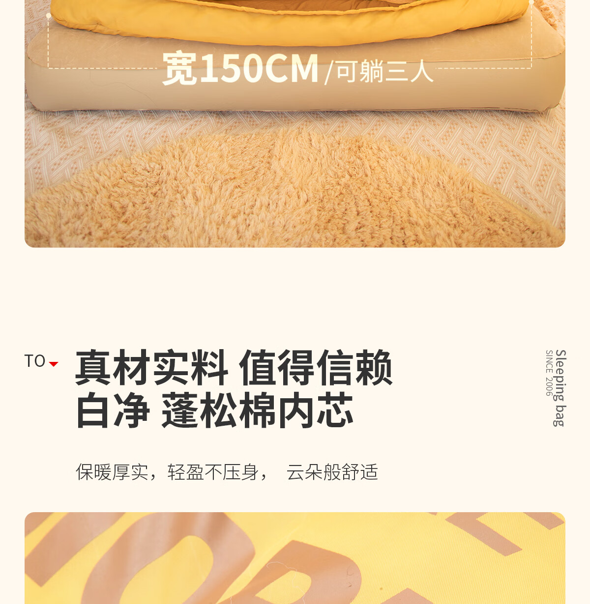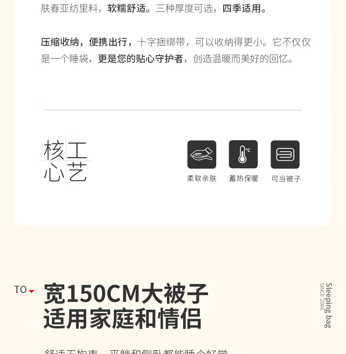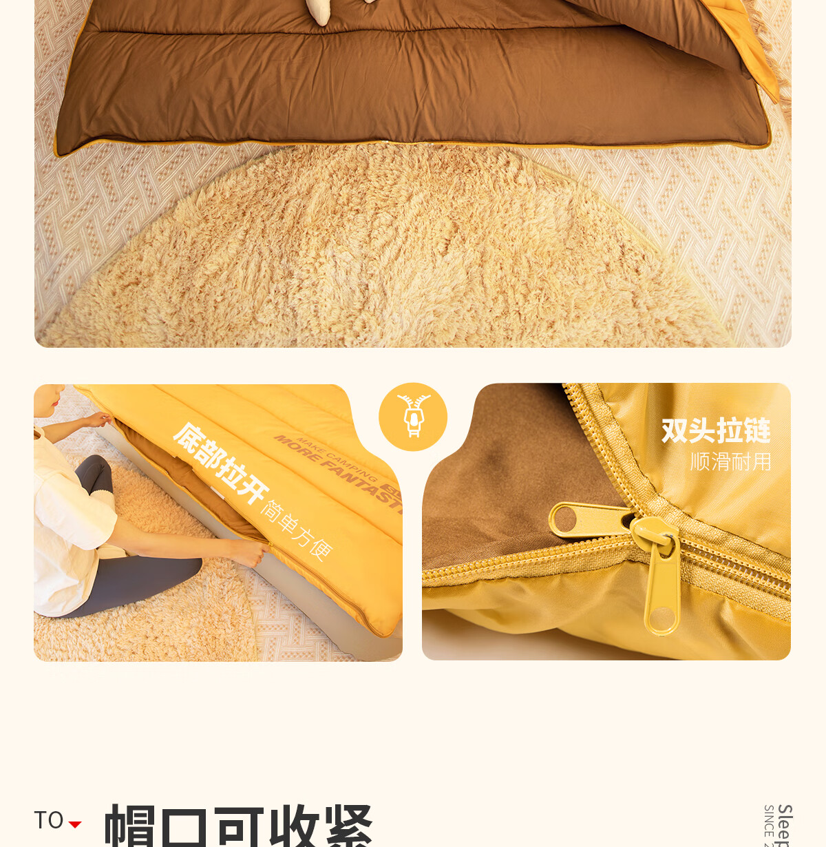 这款双人睡袋完全超出预期!首先,保暖性极佳,夜间低温下依然保持温暖舒适,完全不需要额外加盖。设计非常人性化,采用双向拉链拼接功能,既能独立使用又能组合成超大空间,翻身不束缚,加厚防风帽和底部透气拉链设计细节满分。材质亲肤柔软,无任何异味,内胆可拆洗非常方便,收纳后体积小巧,适合露营携带。性价比很高,对比多家后入手果然没失望,尤其适合情侣或家庭出行,强烈推荐给追求实用与舒适兼顾的户外爱好者!