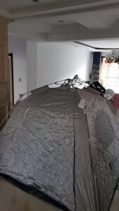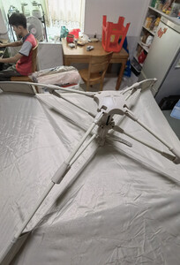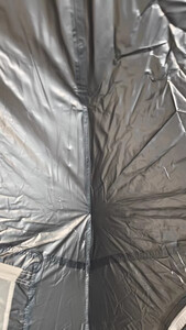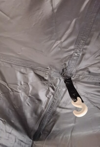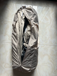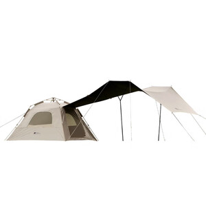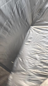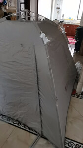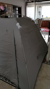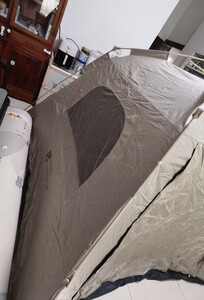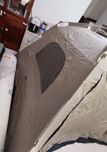 到货了。这几天连续大雨,没法找个露营场地实地撑开试一试,在屋里只打开帐篷研究了下。确实如产品介绍所言,帐篷打开非常容易,顶上连杆推上就撑开了,两面门、两面窗,其中一门帘端部有拉链,联系天幕用。天幕比较简单,找到了端头,分别连结Y型杆两段和风绳,没有再打开看。基本能够判断,撑好后会是一款大气、优雅的帐篷+天幕。