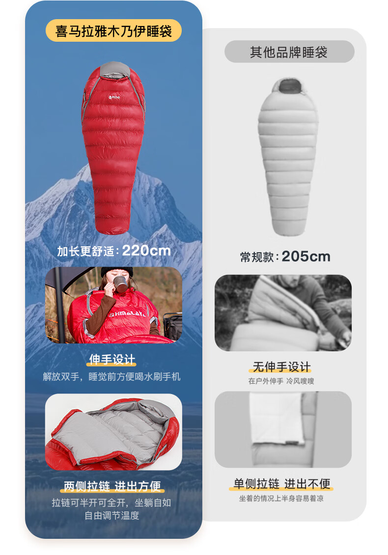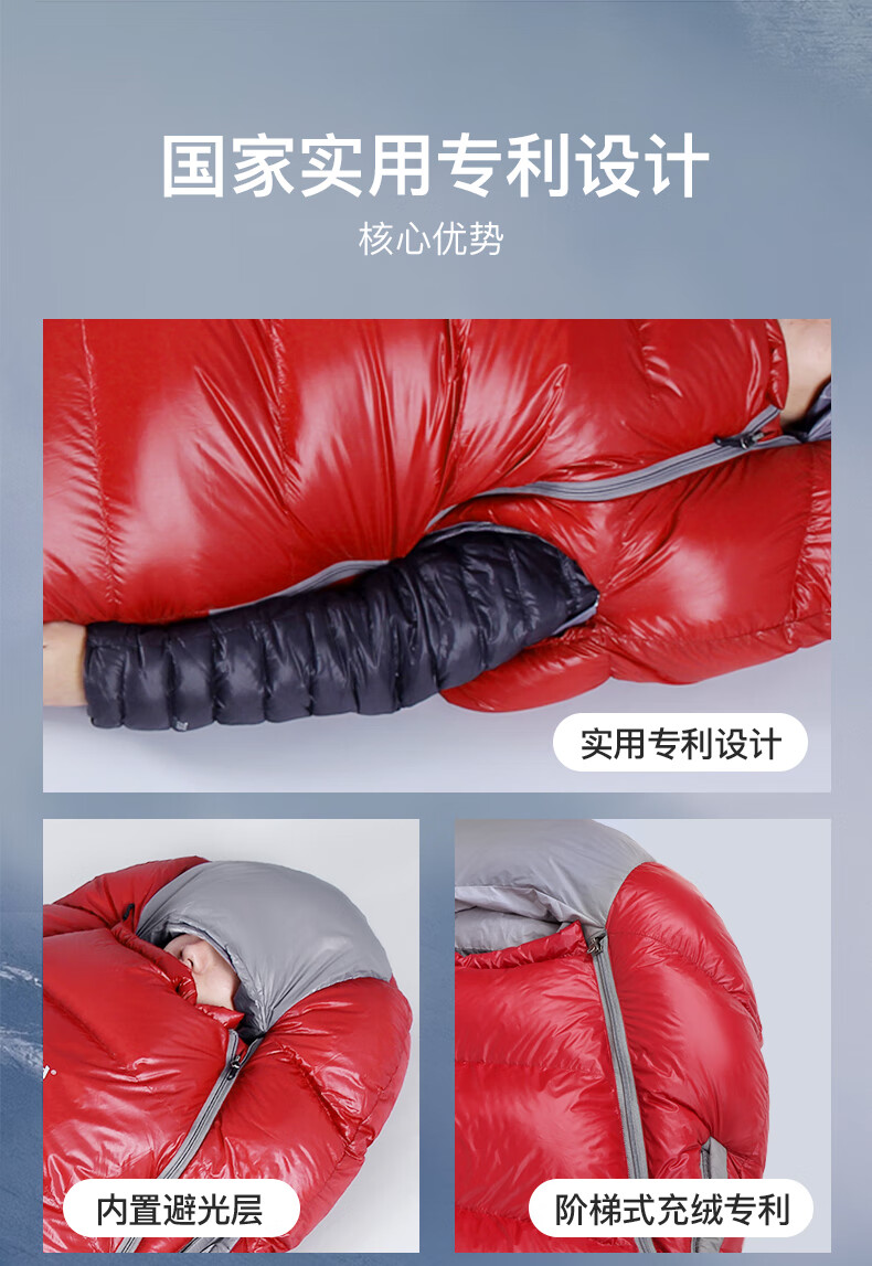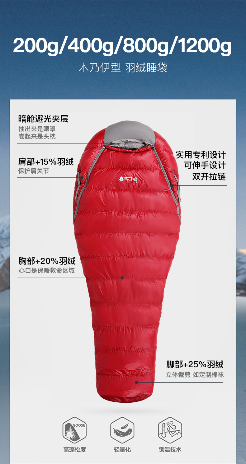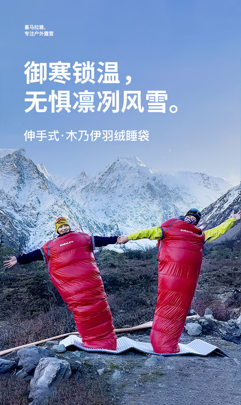 喜马拉雅这款羽绒睡袋超轻便携,加厚设计搭配白鹅绒填充,抗寒效果出色。石墨烯科技加持,保暖性更强,木乃伊造型贴合身形,户外使用十分舒适。整体品质优秀,是寒冷环境下露营的理想选择。