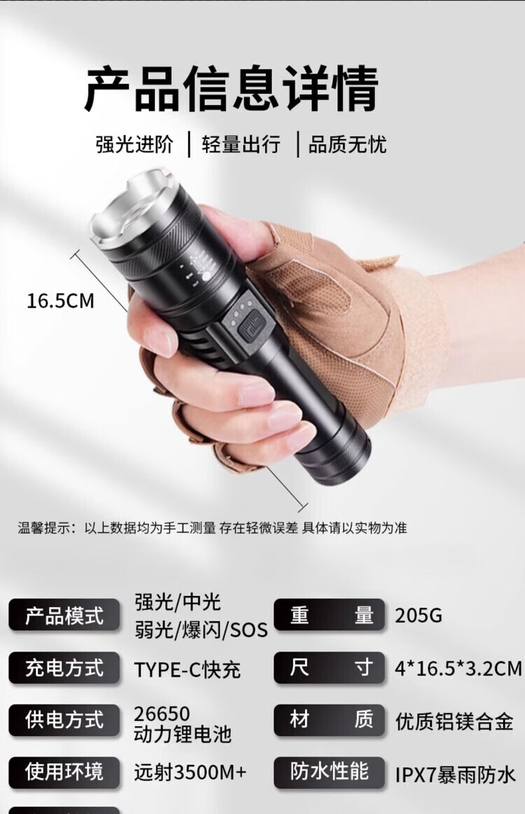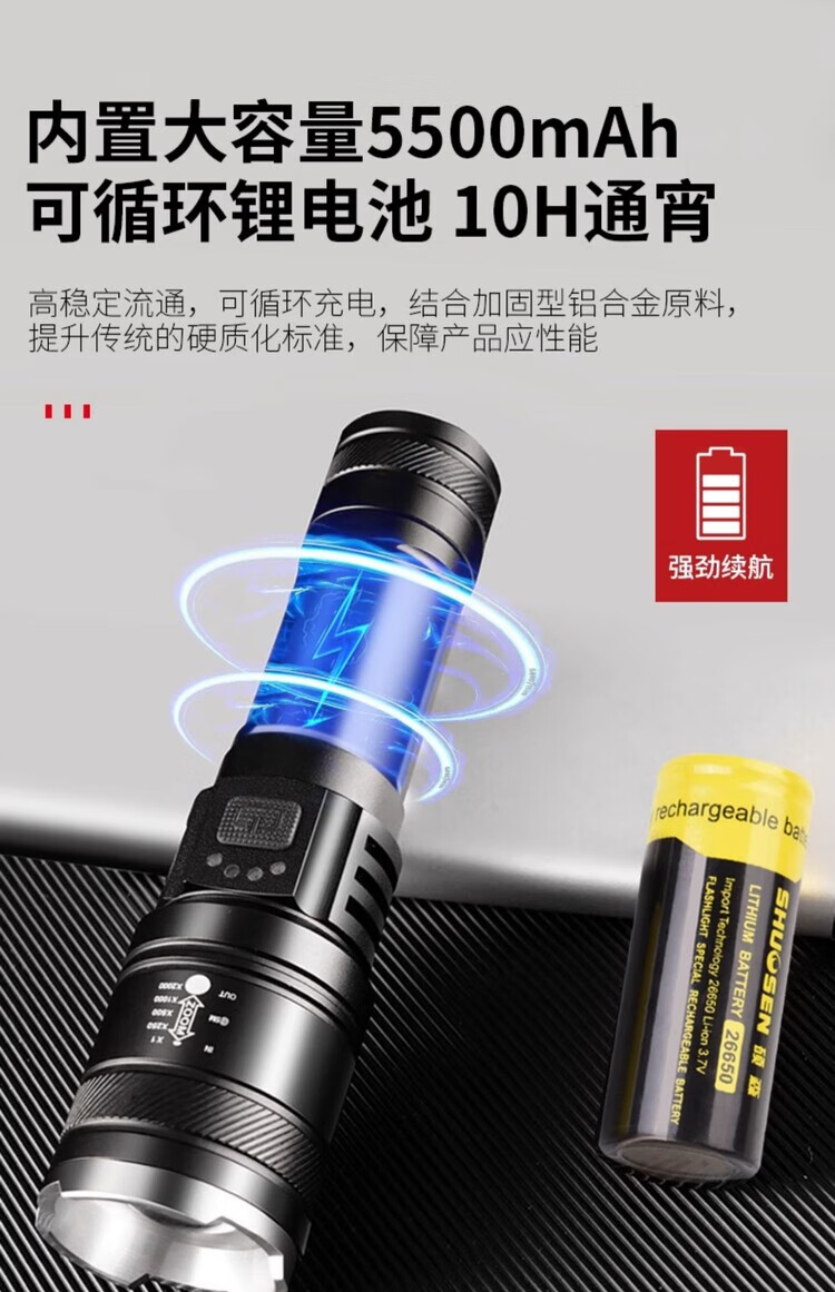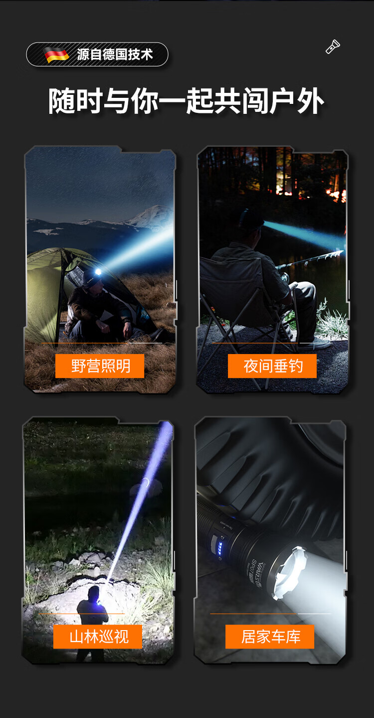 伯班克德国品质强光手电筒强光200000流明穿天炮超长续航野外生存大容量 65w至尊款 超长续航