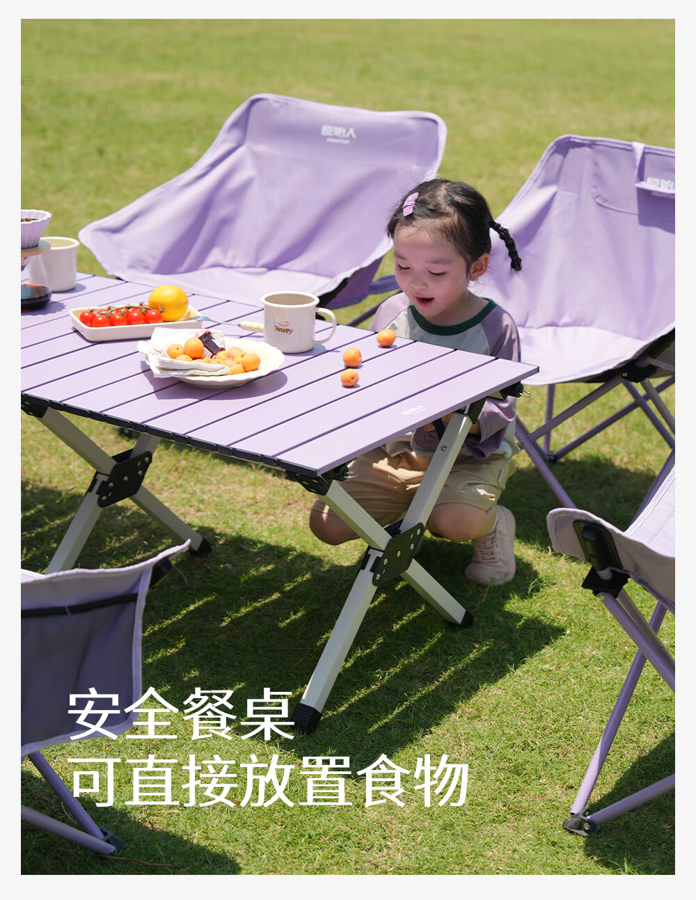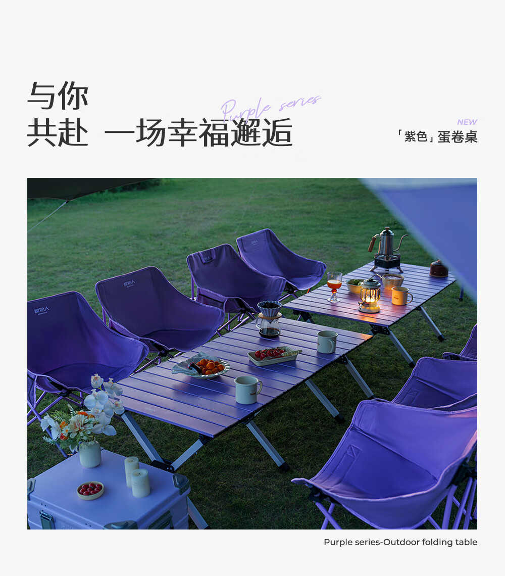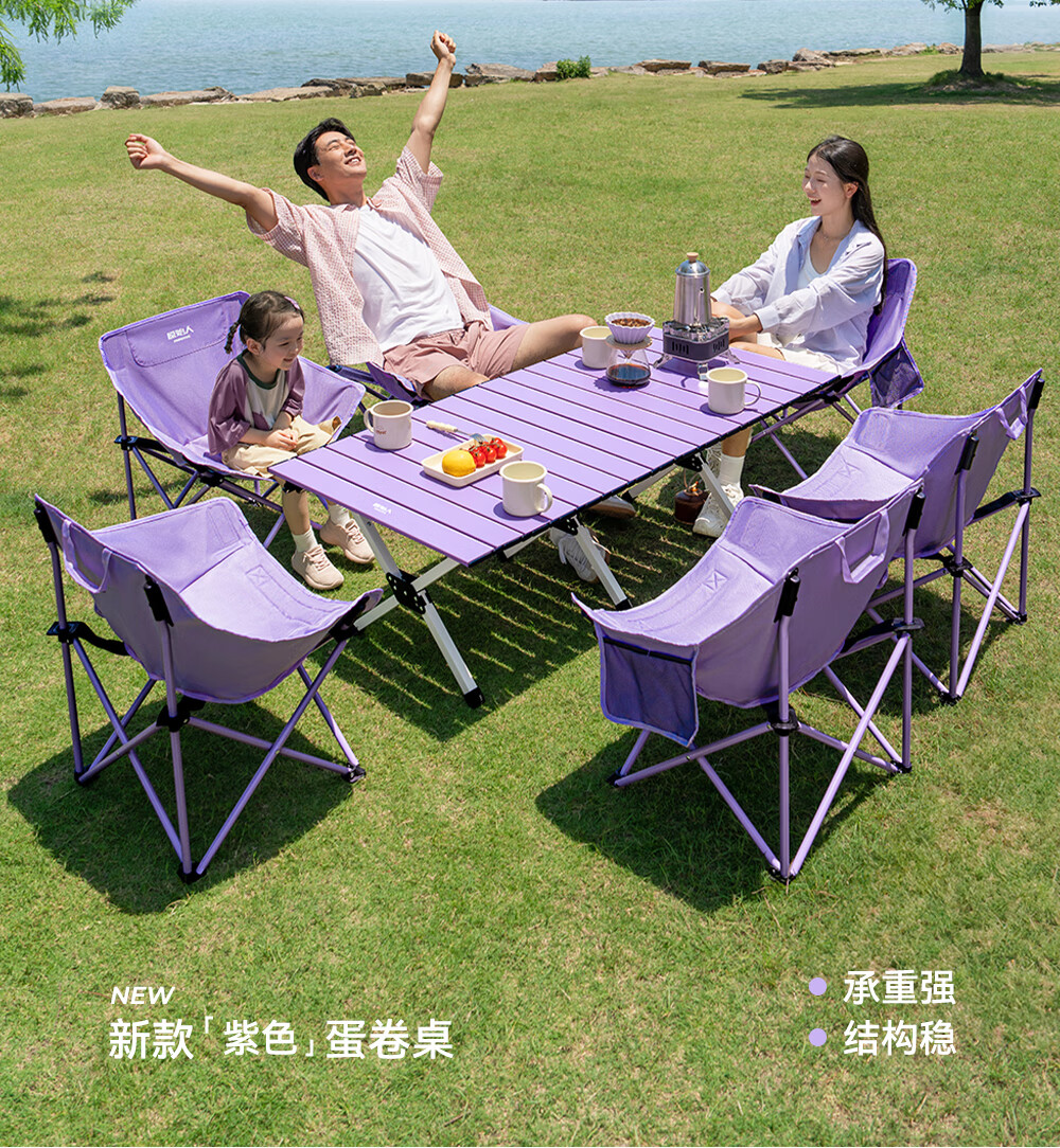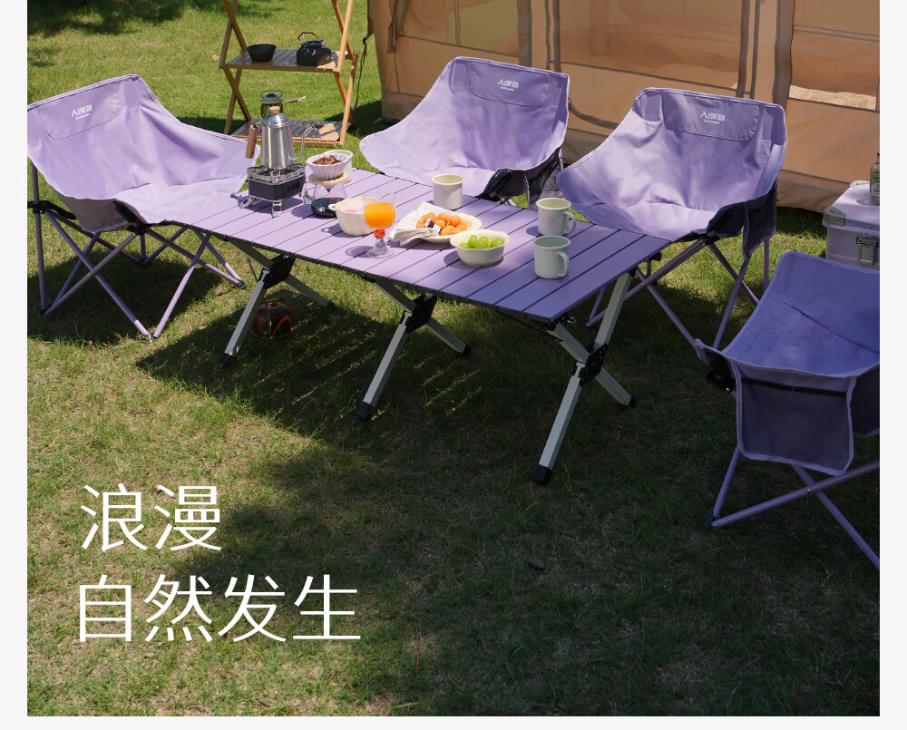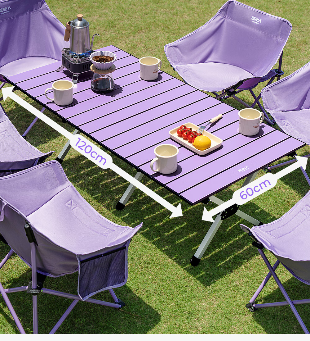 原始人蛋卷桌露营桌椅户外折叠便携式野餐全套装备新款桌椅套装野营摆摊 120cm薄雾紫+经典款月亮椅*4