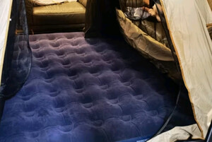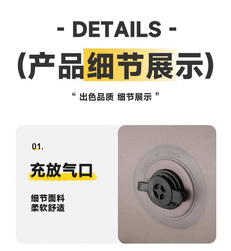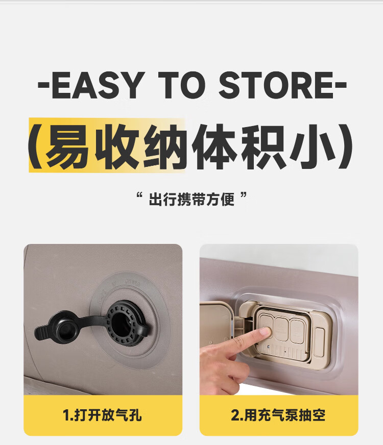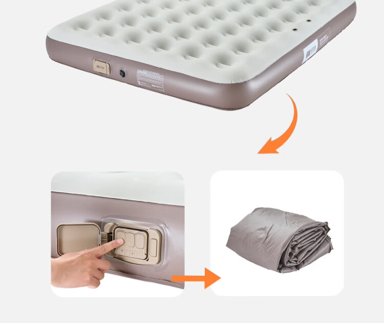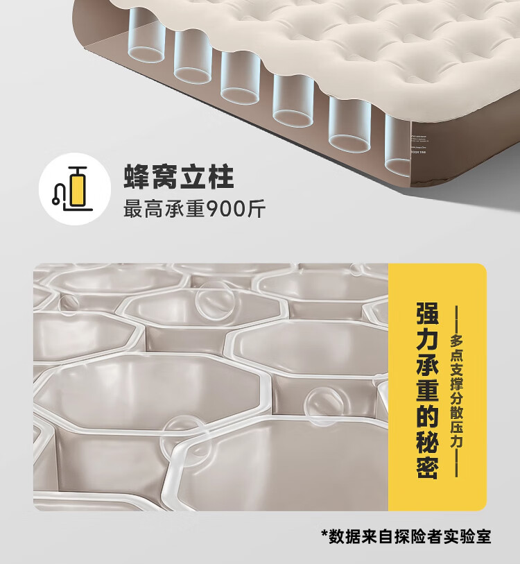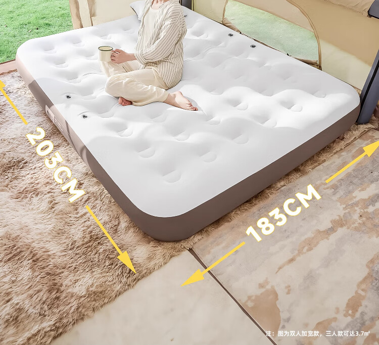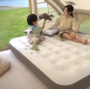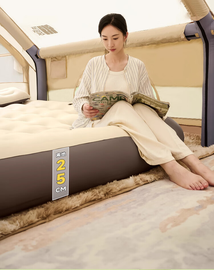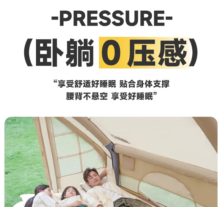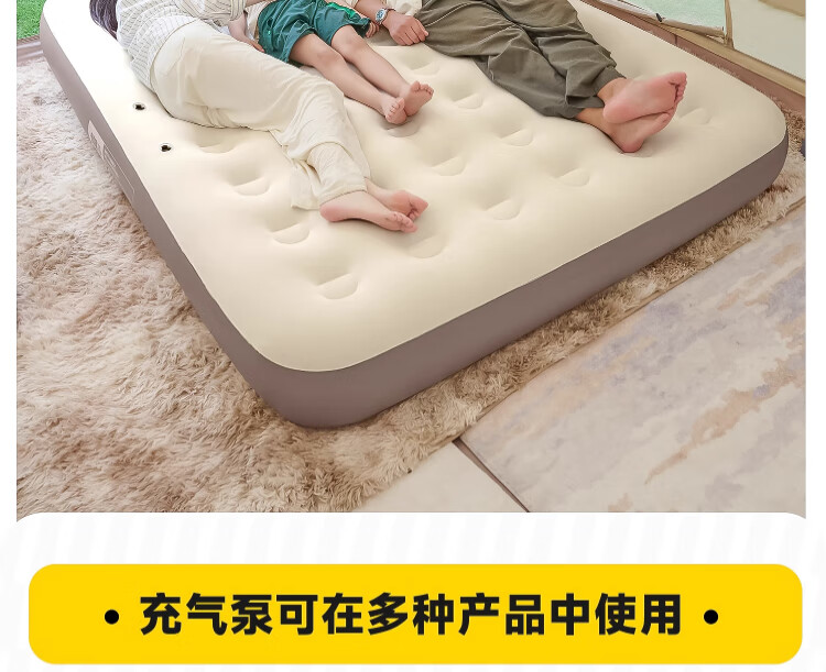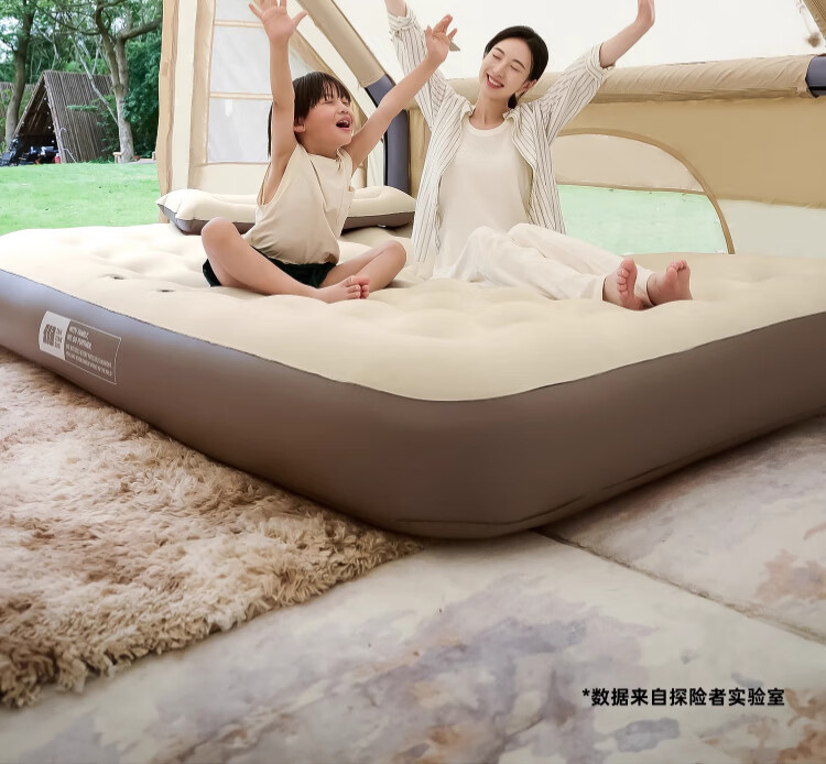 它是全自动充气的,一键充放气超方便,搭个天幕的功夫就充好了,气泵声音也不大,完全不会打扰到周围人。表面是绒皮的,躺上去既不会发粘发热,还特别舒服,就像睡在自家柔软的大床上一样。 _ 气垫的厚度很够,躺在上面很有支撑感,实测在地毯、木地板、水泥地三种地面均无明显下沉感,防潮性能也通过了国家质检中心2025年Q1检测报告验证,哪怕地面有点潮湿也不怕。而且它是大品牌,质量有保障,客服的服务态度也超级好,有任何问题都能耐心解答。唯一有点小不足的就是有点味道,但散一散就好了。总之,这款充气床垫让我的露营体验提升了好几个档次,强烈推荐给喜欢户外露营的小伙伴们!