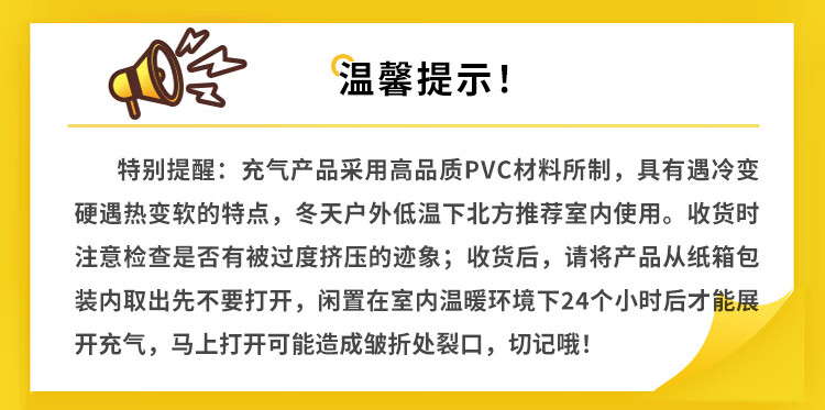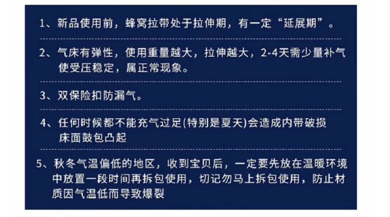 漏气,漏气,漏气,睡了一晚,不停的补气,漏气后屁股着地,大家购买注意了。 我买了两次,第一次是1.4米的,没有问题,第二次购买的2米的,漏气。 反馈客服,客服非说前几次需要补气,后面就好,根本不是这个问题。