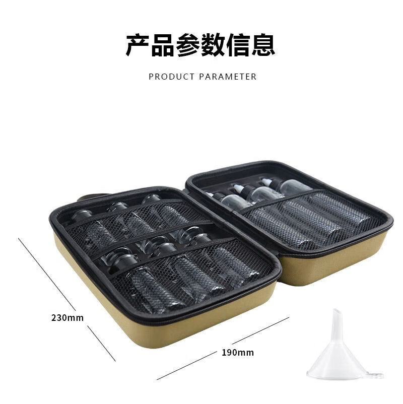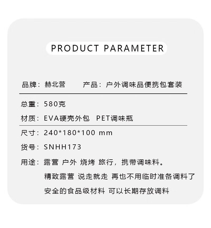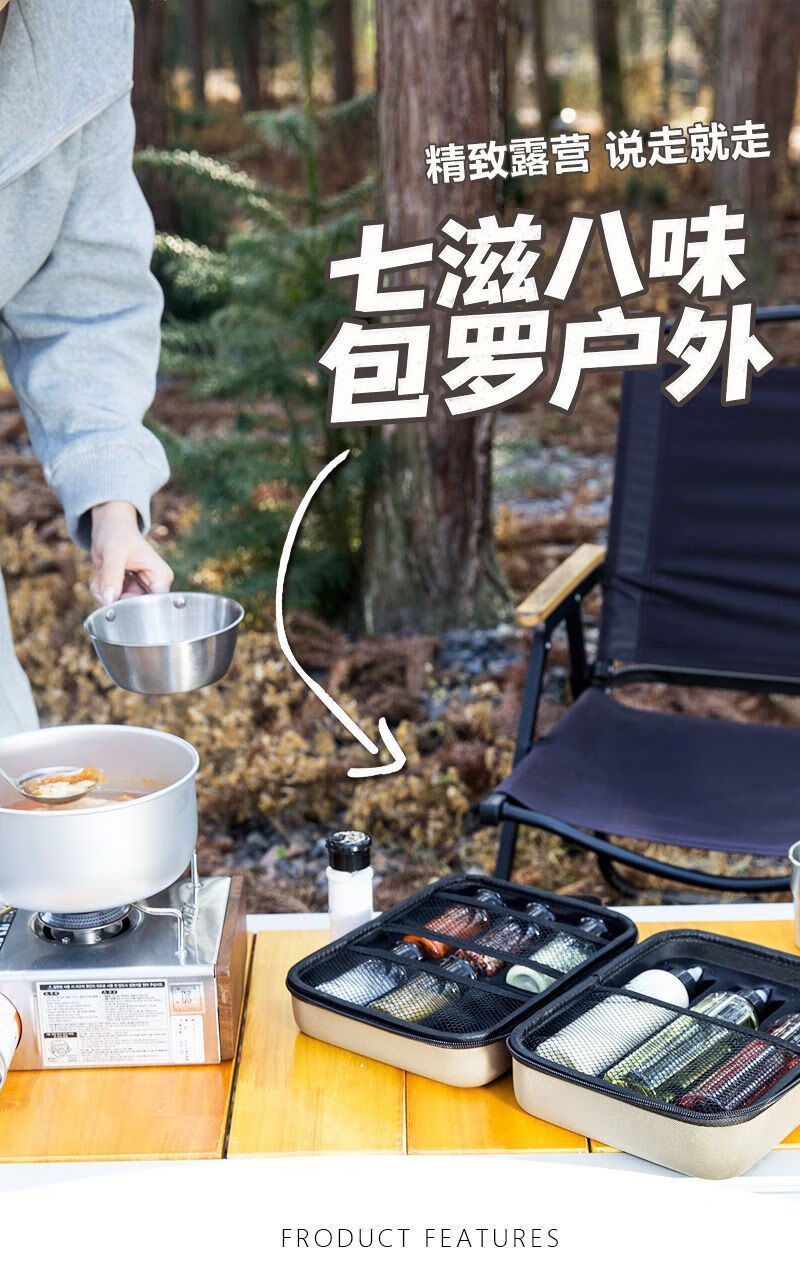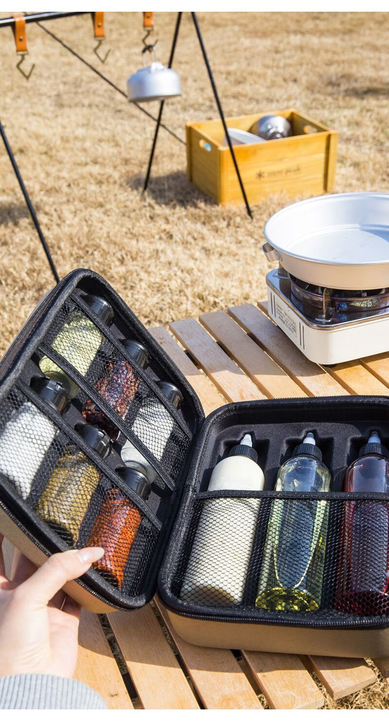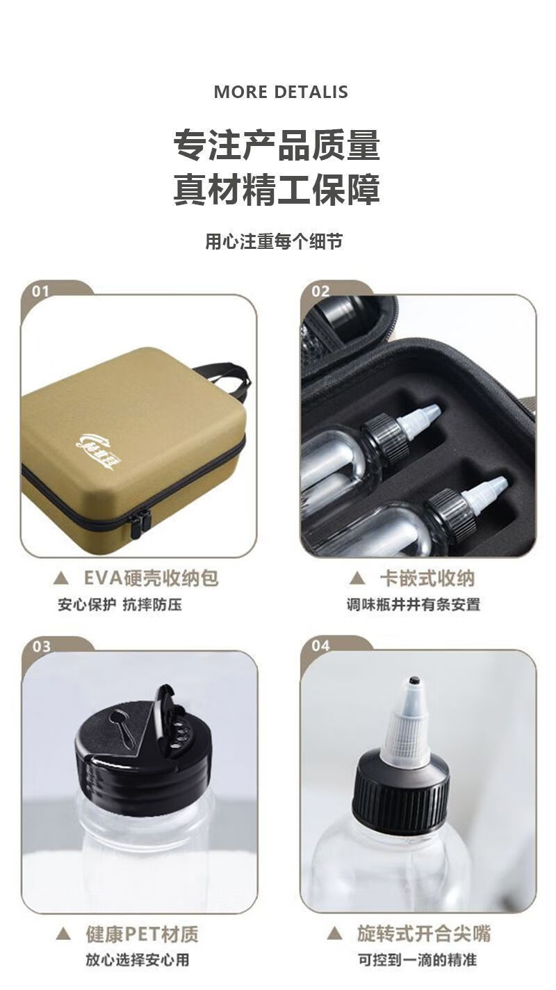 EVA材质轻盈,韧性好不易坏。密封严实,调料不返潮不串味。设计很人性化,从瓶子到收纳盒,都考虑到了户外使用的需求。尤其是旋钮开关尖嘴很精准,也更加好控制。
