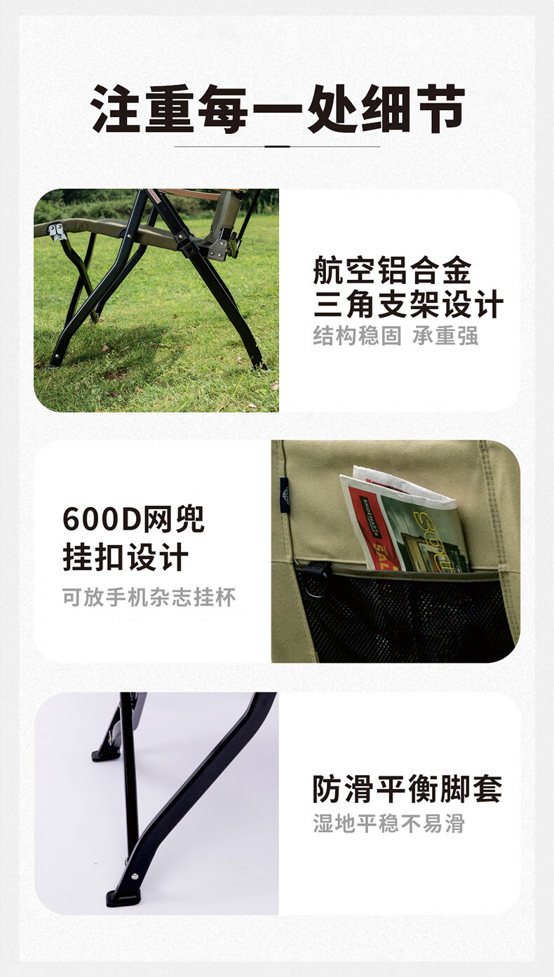 躺椅做工精细,特别喜欢护手的外形,细微之处都体现出设计周到合理,重量轻却很稳固,靠背高度合适。