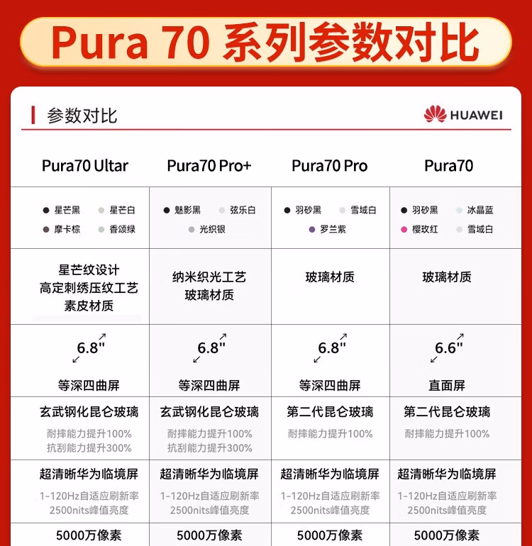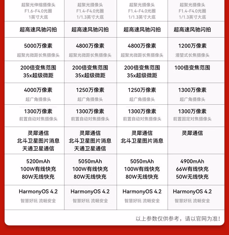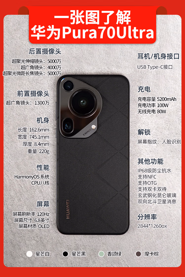 AI大模型,卫星通话,LTPO屏幕,高频PWM调光,全焦段影像,潜望式长焦,防水防尘,无线充电,NFC,红外遥控,大底主摄,等深微曲屏