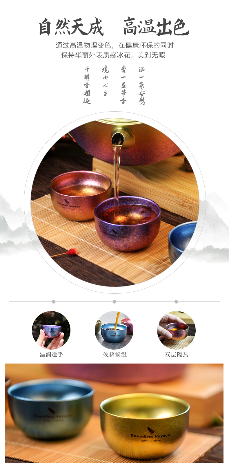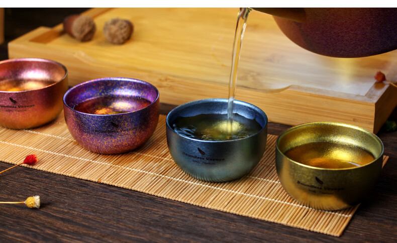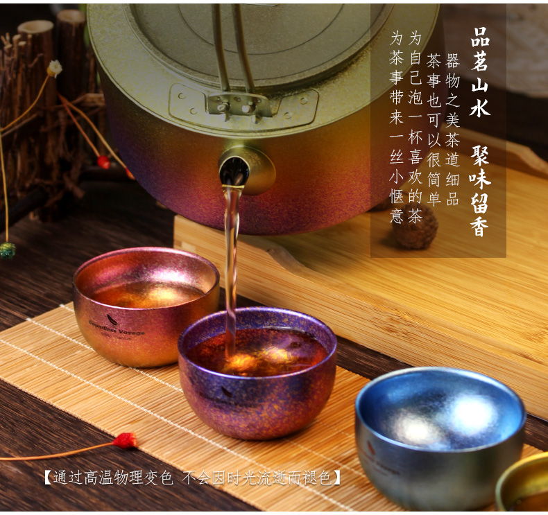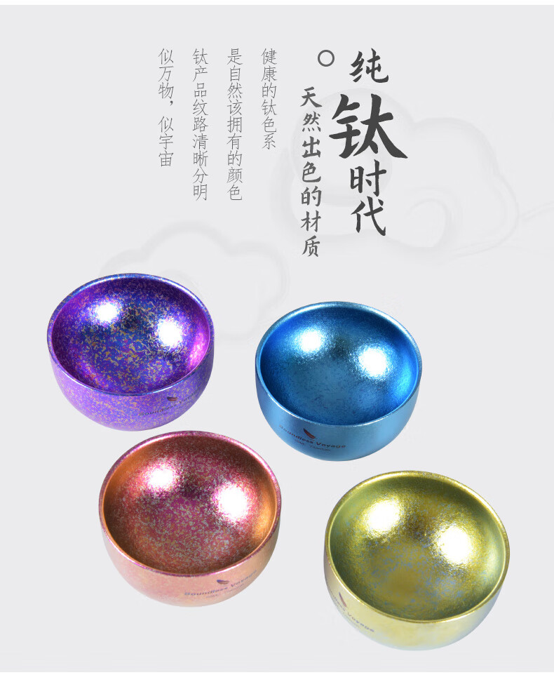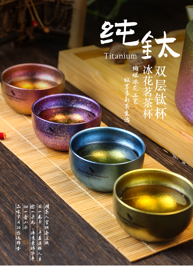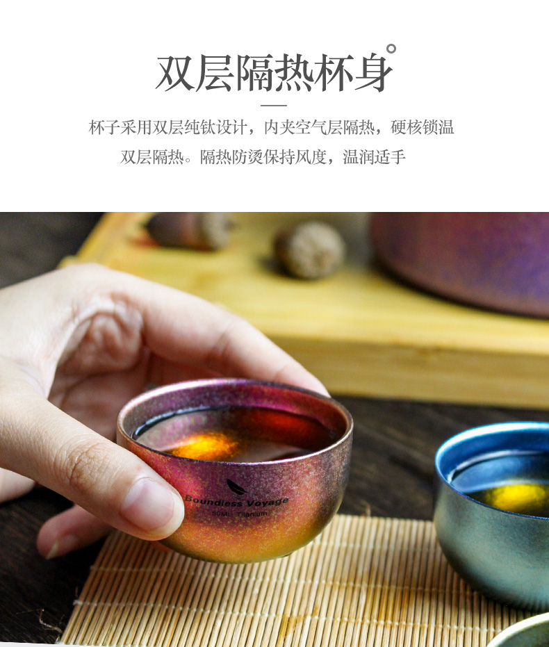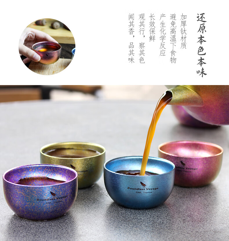 这个钛茶杯是经过高温烧制呈现出的彩色,所以不用担心褪色或者健康问题。必唯的这套四色套杯很适合户外露营携带,不用担心碎裂。这个杯子是双层的不会烫手。非常值得入手的户外茶具。