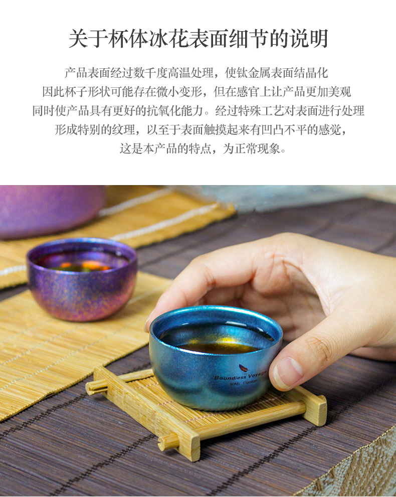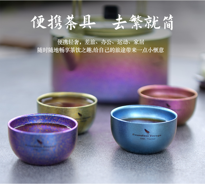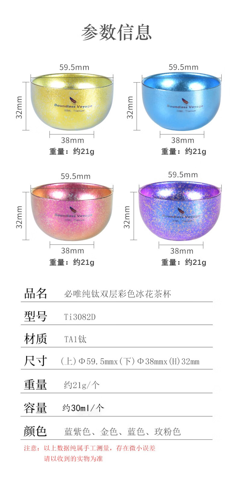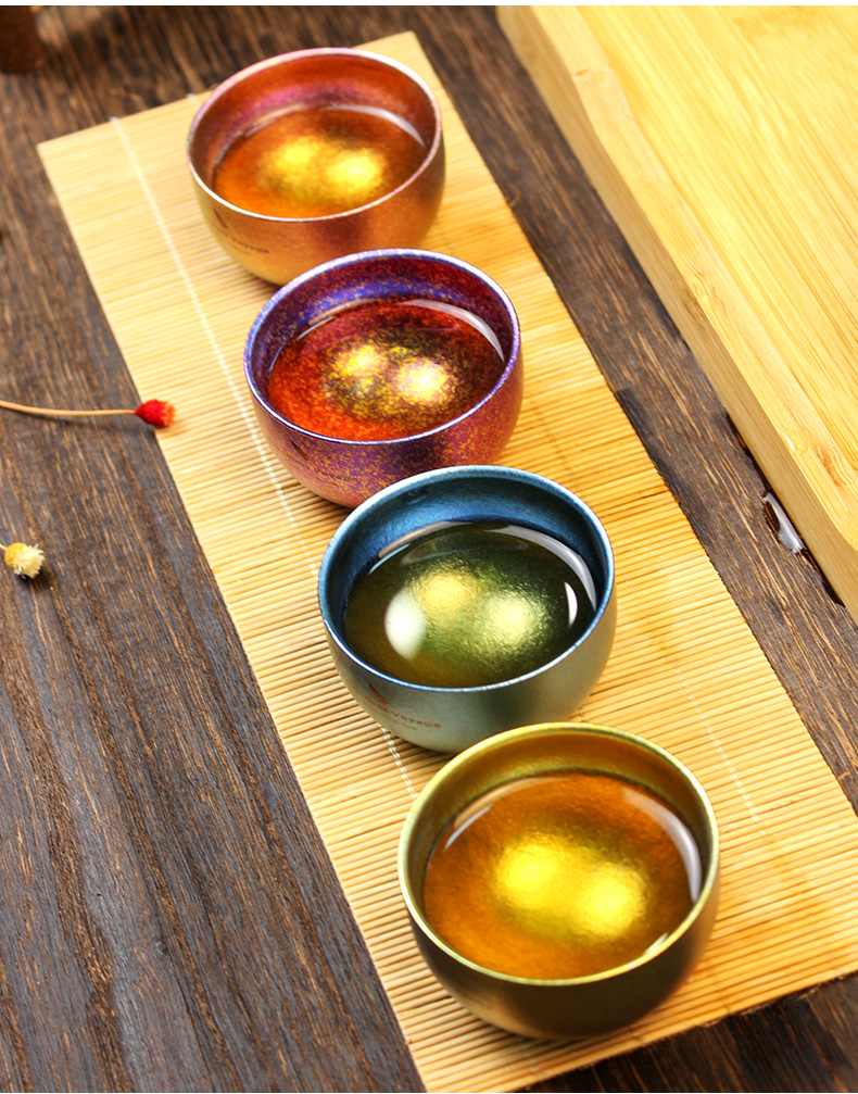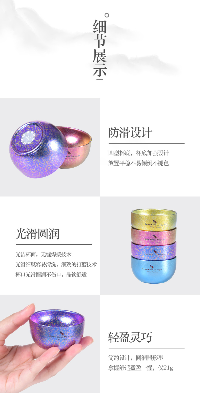 这个钛茶杯是经过高温烧制呈现出的彩色,所以不用担心褪色或者健康问题。必唯的这套四色套杯很适合户外露营携带,不用担心碎裂。这个杯子是双层的不会烫手。非常值得入手的户外茶具。