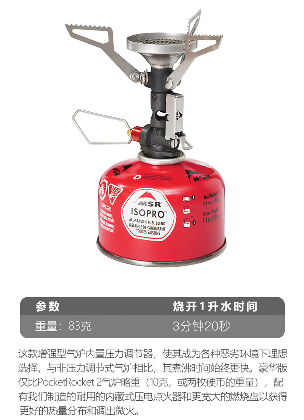 Msr出品必属精品。火力猛,可以高效的把气罐的气用完。再高海拔,发挥也很稳定。不怕风吹而熄灭。很适合户外徒步登山等活动。