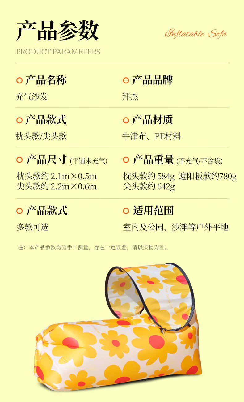 拜杰(BJ) 充气沙发太阳花色户外气垫床便携懒人野营折叠躺椅网红充气垫 太阳花带遮阳充气沙发