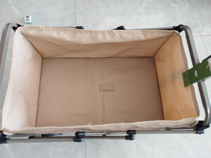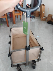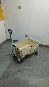 这款手推车是目前所见到的比较结实的一款。这个框架钢结构的很厚,而且相对来说比较重,手拉的话也比较好,拉轮子的转向很灵活,轮子比较大,可以盛200 多升的东西。如果把后盖儿打开的话,装的更多,估计可以装400~500升。所以说露营野餐,如果装备很多的话,也可以一车解决