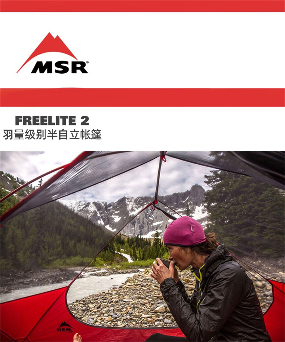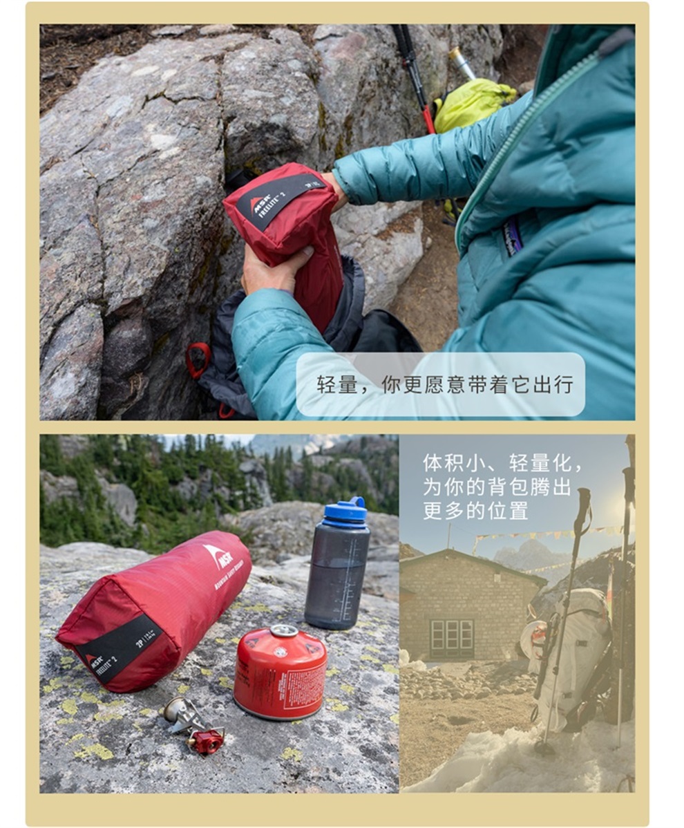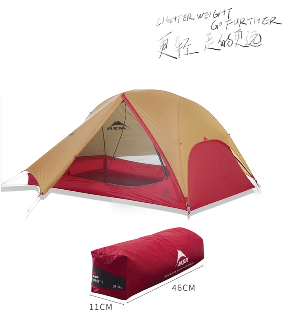 非常轻量的一款帐篷,双人双层带帐杆只有910克,很多1.5层的非自立双人帐也差不多就是这个重量。msr的做工真的好,没有异味,面料轻薄丝滑。需要注意的是这个帐篷并不是纯自立帐,在不能打钉的地面,需要配合登山杖或是木棍把帐尾撑开。迎风面最好是帐首,这类帐篷侧面都不太抗风。大风天气把附带的4个风绳都拉上,需要自己额外准备4根地钉。