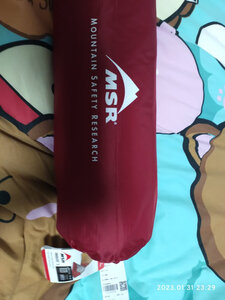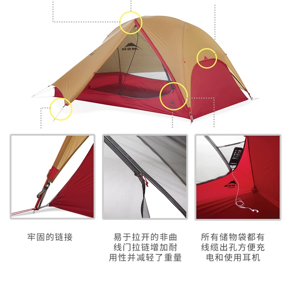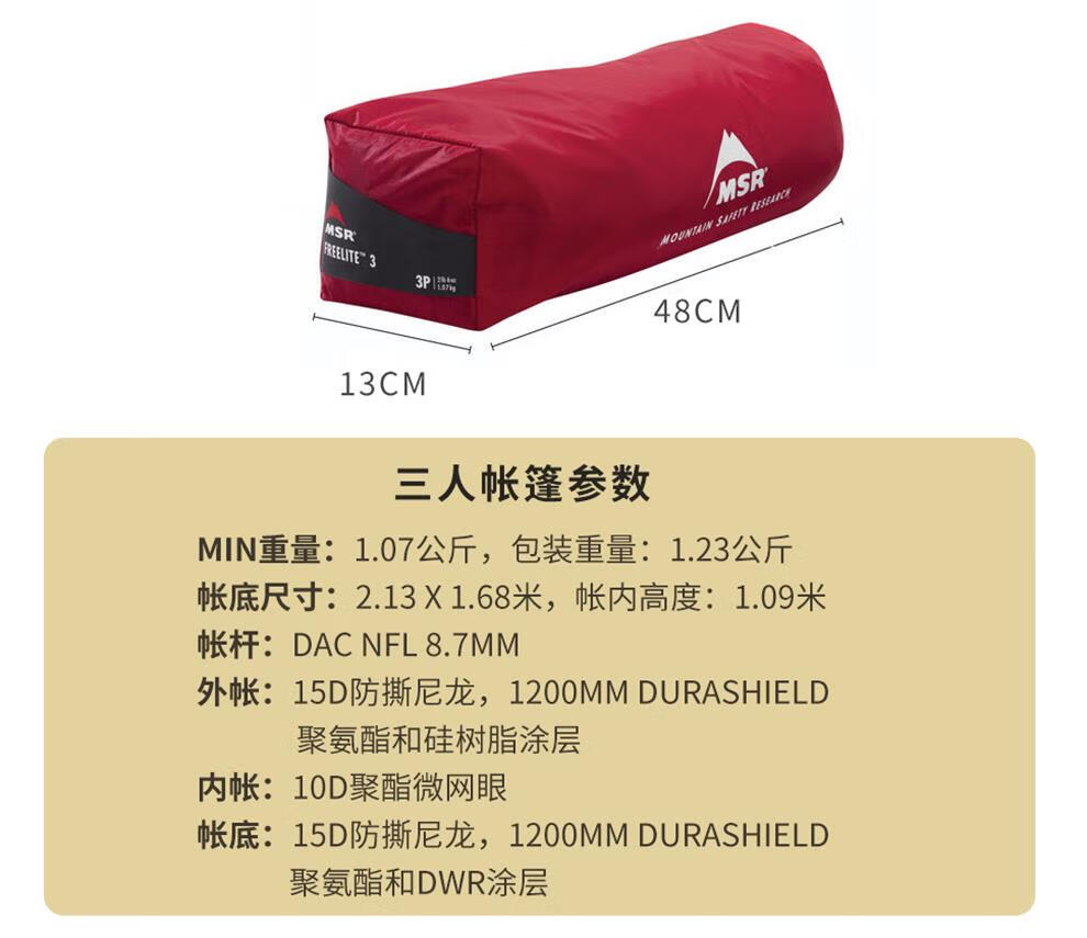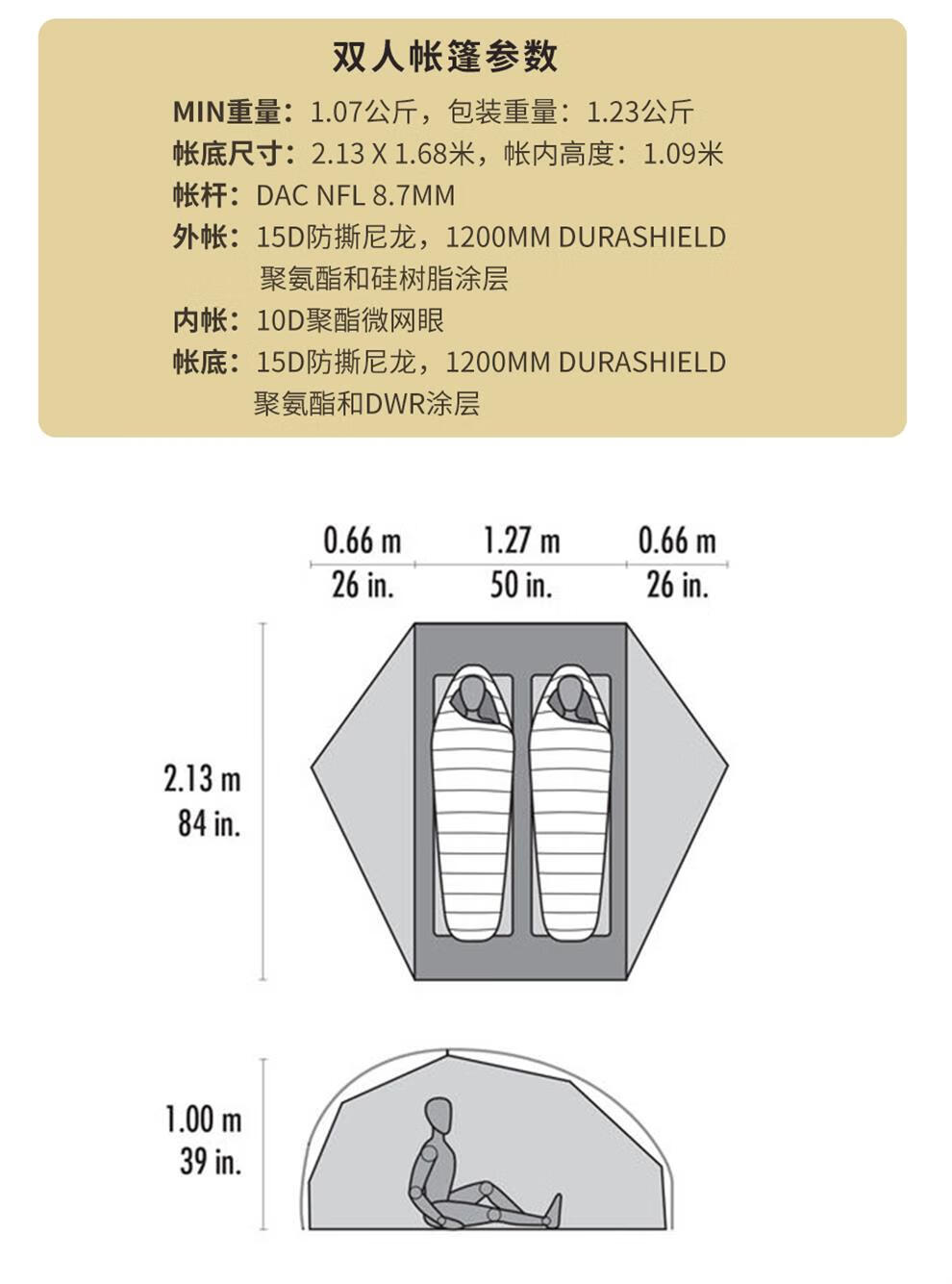 非常轻量的一款帐篷,双人双层带帐杆只有910克,很多1.5层的非自立双人帐也差不多就是这个重量。msr的做工真的好,没有异味,面料轻薄丝滑。需要注意的是这个帐篷并不是纯自立帐,在不能打钉的地面,需要配合登山杖或是木棍把帐尾撑开。迎风面最好是帐首,这类帐篷侧面都不太抗风。大风天气把附带的4个风绳都拉上,需要自己额外准备4根地钉。